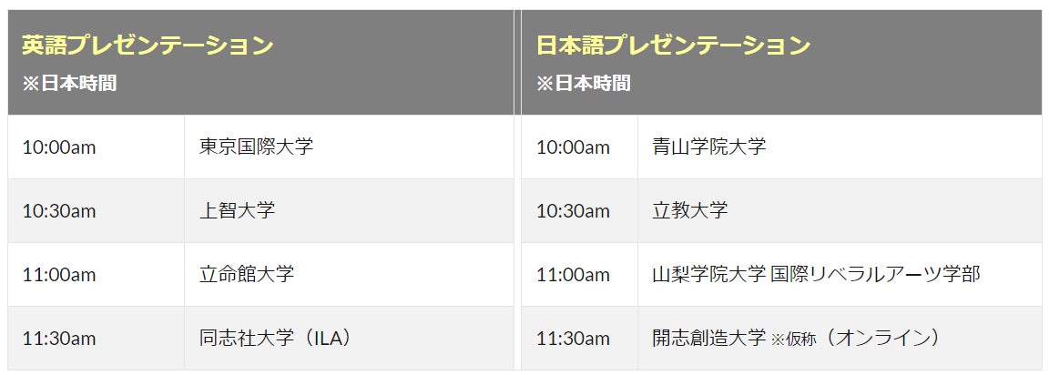 アメリカで日本語情報誌を発行するライトハウス(本社 ロサンゼルス/会長 込山洋一)は、2024年5月22日、23日、24日に「日本の大学 進学フェア 2024春」をオンラインで開催します。国際化を推進する14の大学が参加し、英語での入試制度や、英語によるコース、海外生のための奨学金制度など、各大学の特色や取り組みを日本語と英語の両方で紹介、ライブ配信します。同フェアでは大学の最新情報をお届けするほか、より深く大学を知るための個別相談の申し込みも受け付けます。より国際性・多様性の高い環境で学びたい学生、インターナショナルスクールに通っている学生など、日本在住者の出願も歓迎しています。