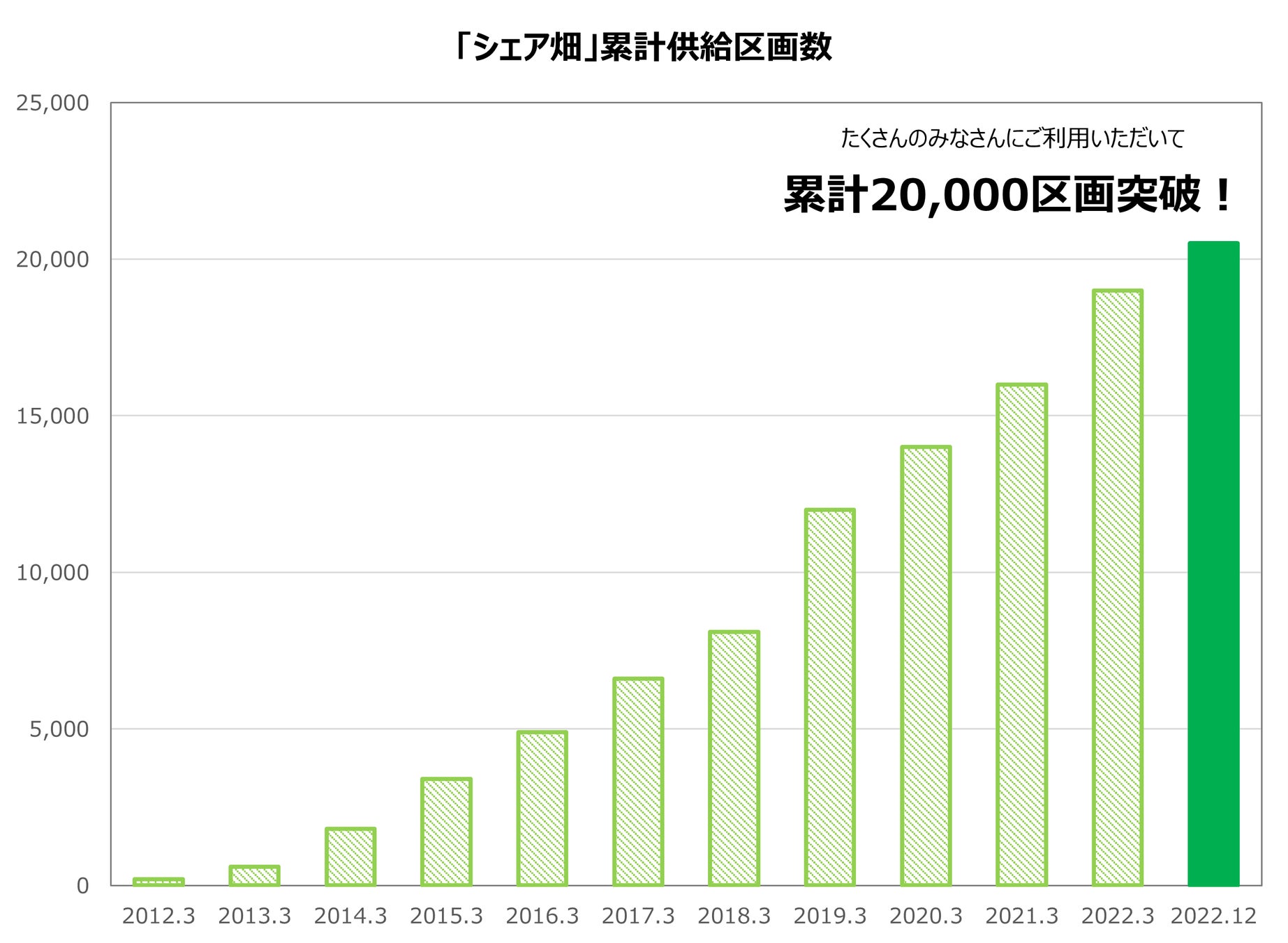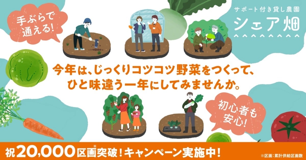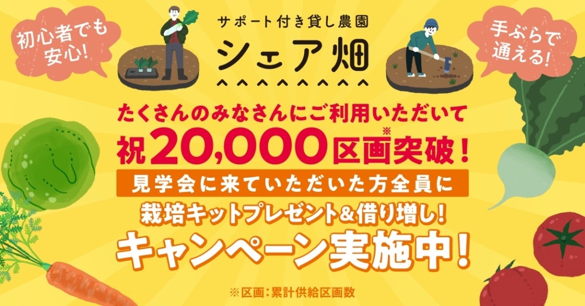 農業ビジネスを展開するアグリメディア(目黒区、代表取締役:諸藤貴志)は、サポート付き貸し農園サービス「シェア畑」におきまして、これまで供給してきた累計区画数が20,000区画を突破したことを記念し、2023年1月6日(金)から「祝20,000区画突破!プレゼントキャンペーン」を実施いたします。