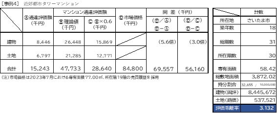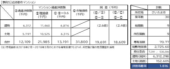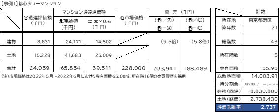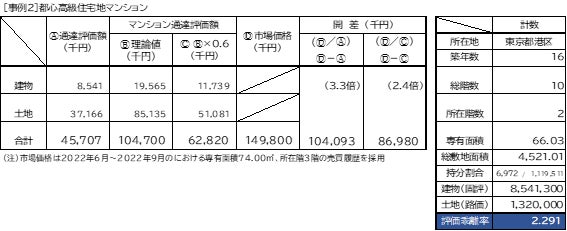 このことから、マンション評価通達案を適用した場合、一般的には、土地のマンション通達評価額が通達評価額の2倍近くとなるが(別紙[事例1・2]、[事例4・5]参照)、その逆に築年数が古いマンションでは、都心のマンションであっても1倍未満となる(別紙[事例3]参照)。