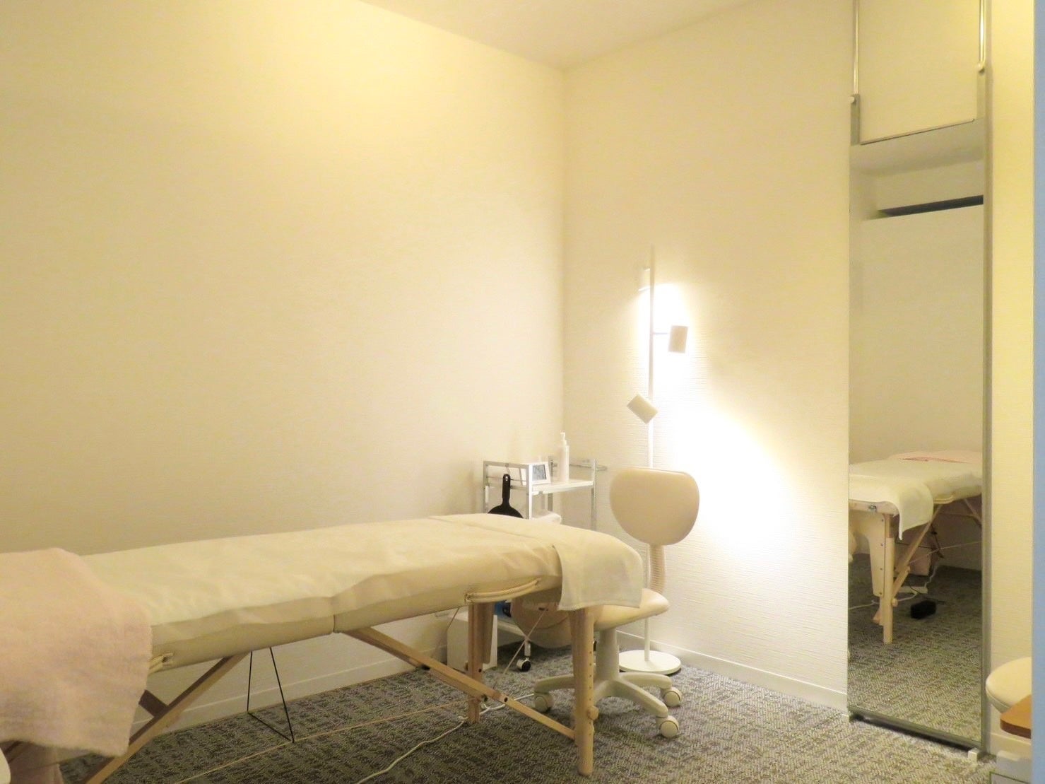 施術ルームはアロマの香りとリラックスできる音楽で落ち着ける空間。