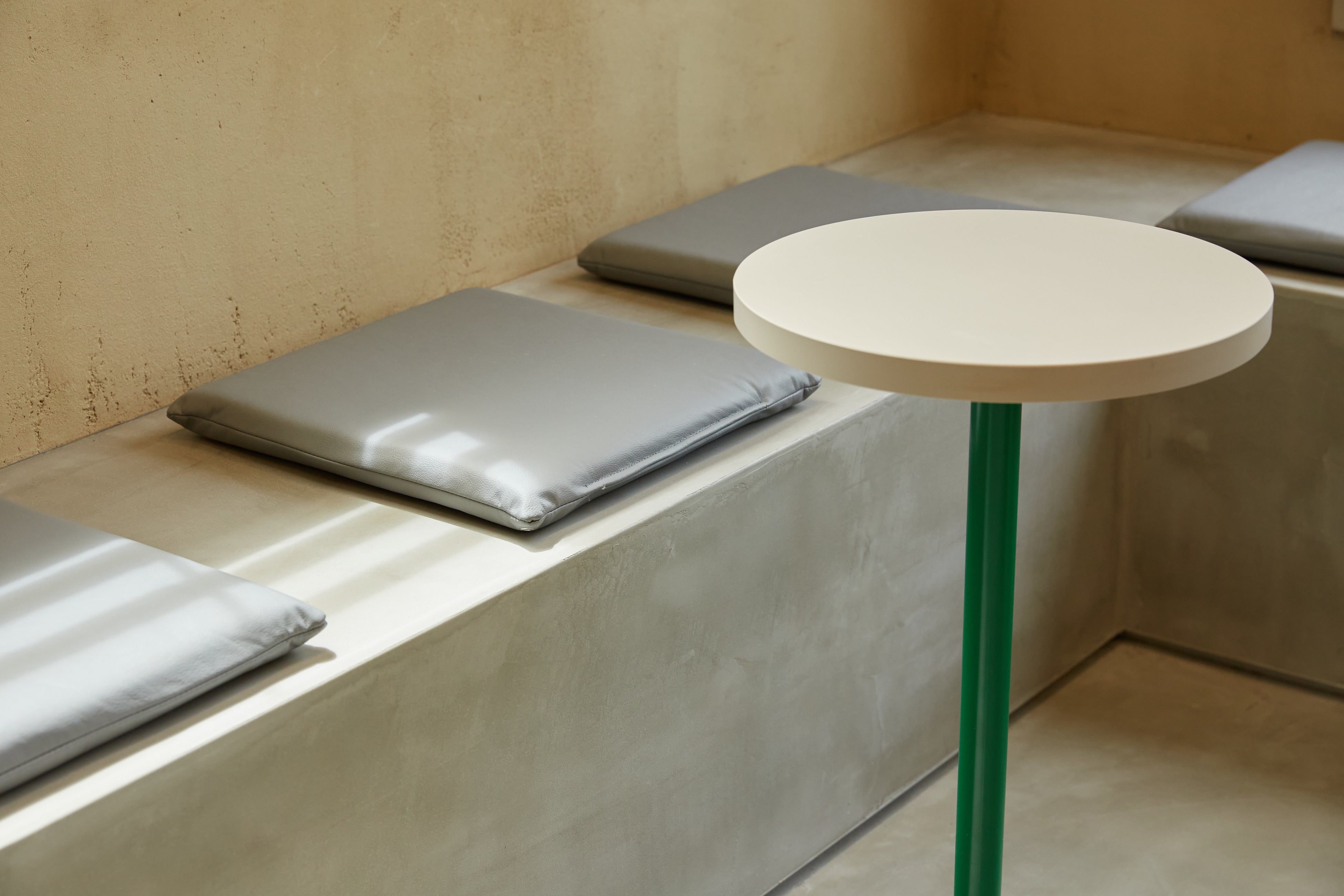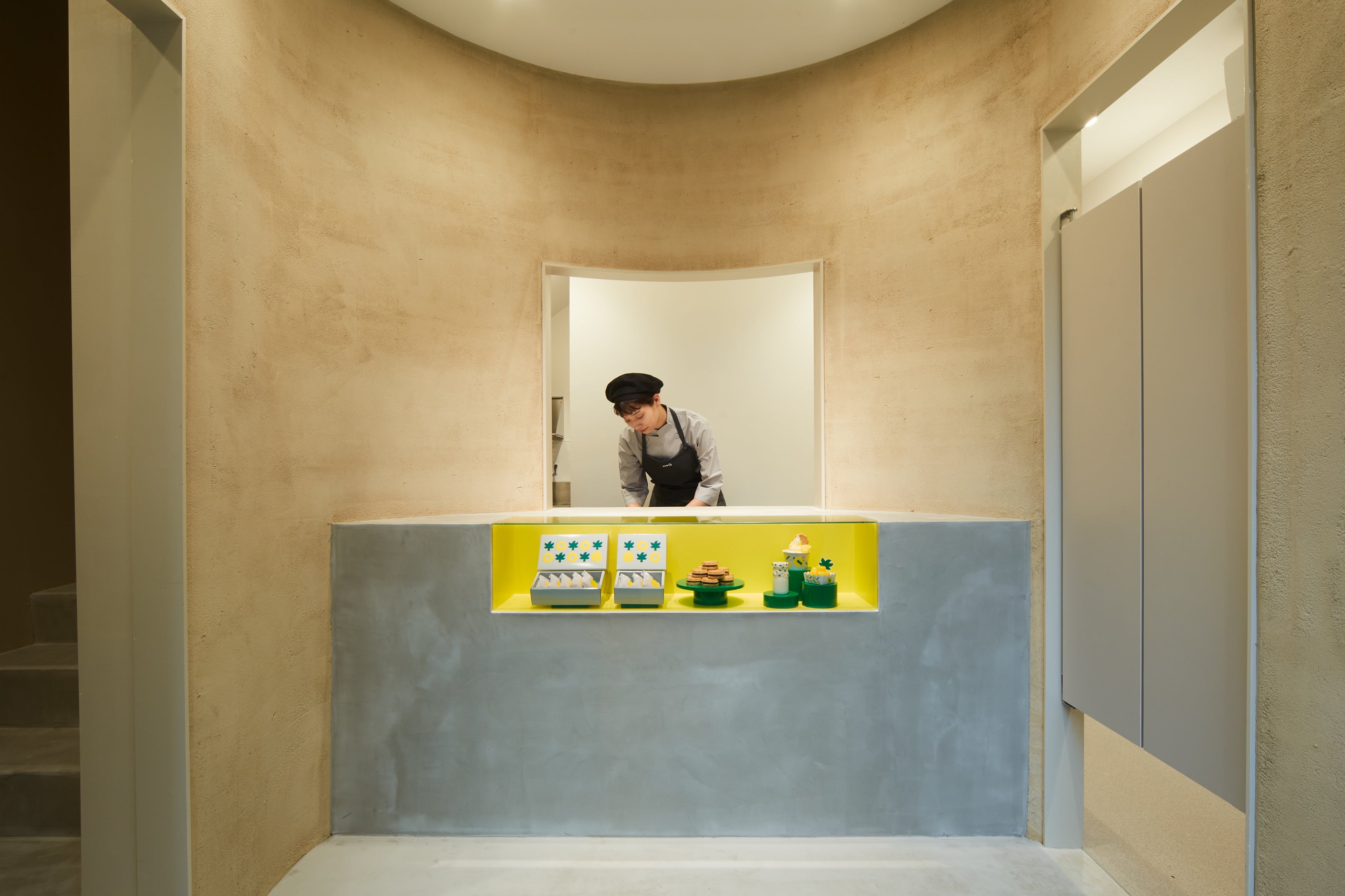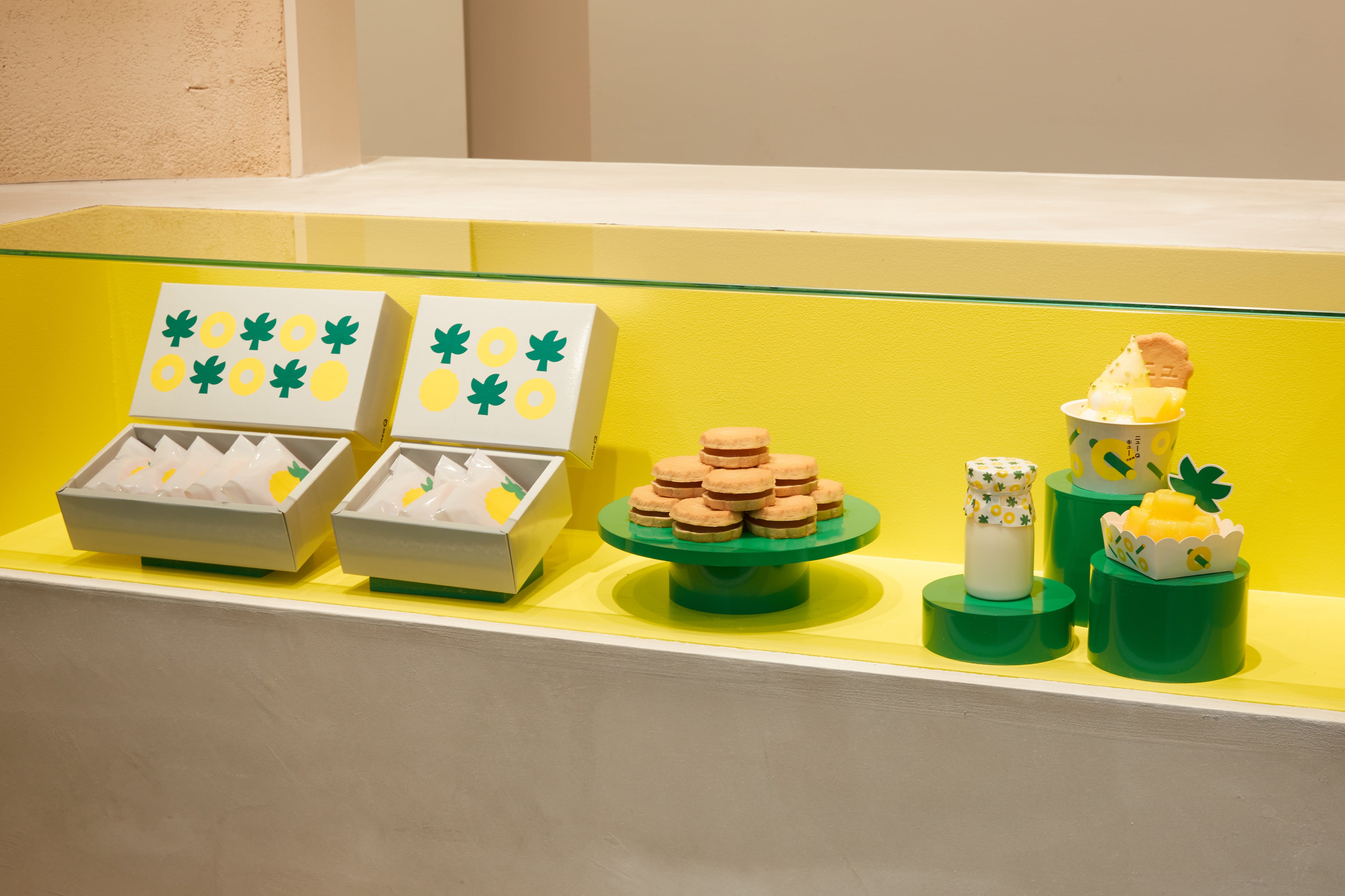 沖縄産の天然岩泥「クチャ」とその風合いを活かし、塗料は使っていません。そのため、ベージュの落ち着いた店舗で、スイーツをゆっくりとお召し上がりいただけます。イートイン用の座席にはパイナップルの葉から作る人工レザーを使用しています。沖縄らしさは守りつつも、ロゴ・看板にはイラストでポップな遊び心を加えています。2Fはフォトスポットとして、パインをイメージした色合いの「ニューキュー」と口にするシーサーが見守ります