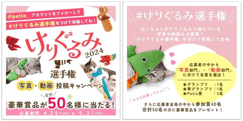 株式会社ペティオ(本社:東京都港区、代表取締役社長:山田武史)は、4月25日(木)よりペティオの人気キャンペーン「けりぐるみ選手権2024」を開催します。当社人気No.1猫用おもちゃ「けりぐるみ」と遊ぶ愛猫の写真や動画をInstagramにて募集します。2024年度は「写真部門」と「動画部門」の2部門を設定。ご参加いただいた方の中から厳正な審査の上、グランプリ、準グランプリ、ペティオ賞をはじめ、合計50名様に豪華賞品をご用意。皆様のご参加を心よりお待ちしております!