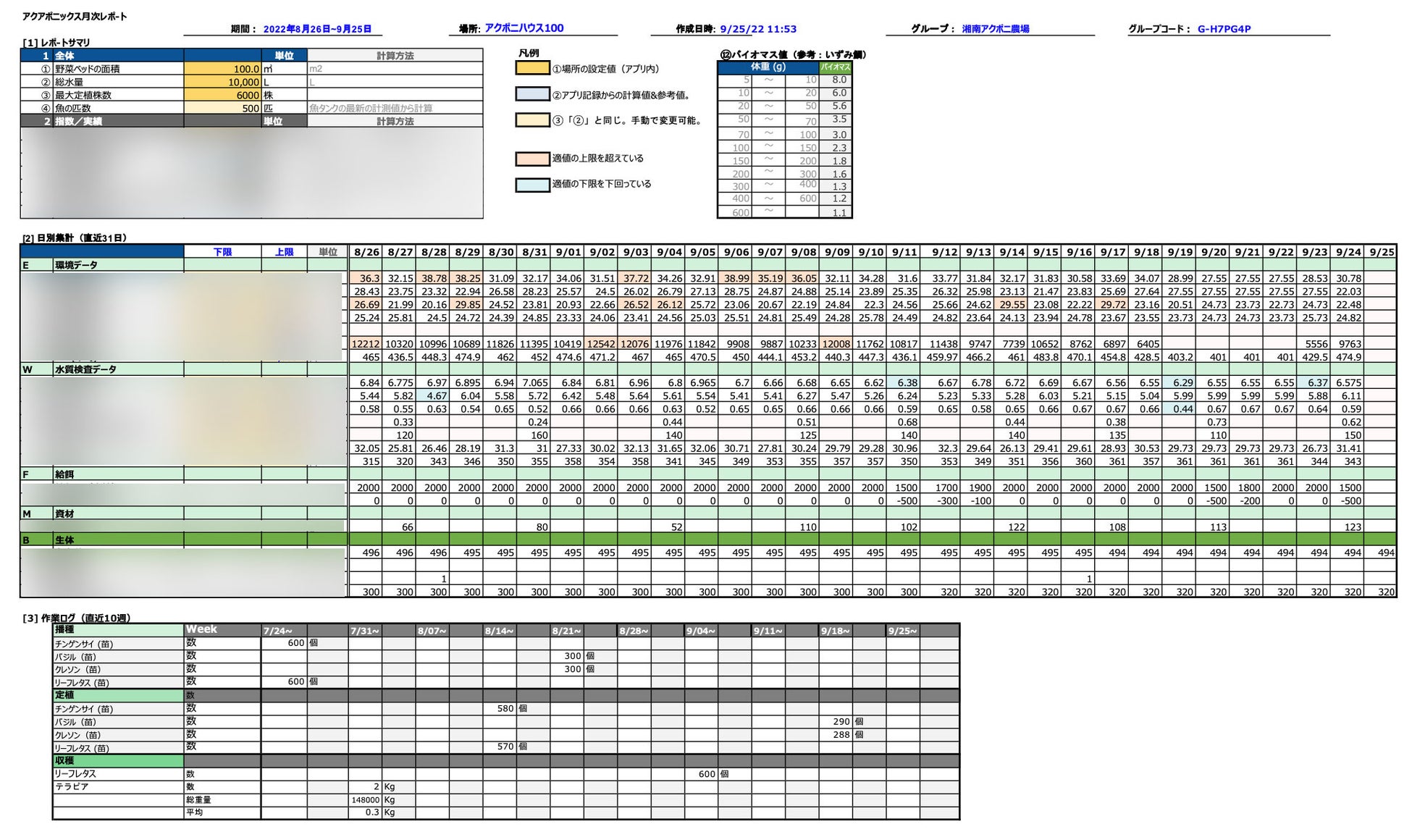・作業データ(播種、定植、収穫、環境チェック、観察記録、稚魚投入、死魚チェック、体重計測、追肥、収穫等)