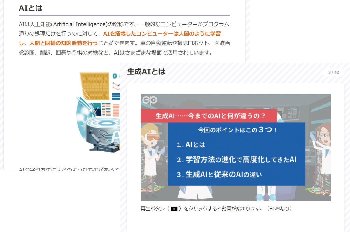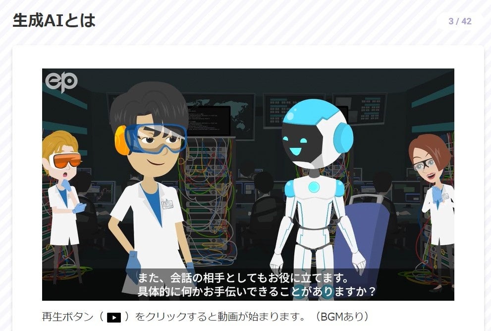 教材は10分前後で学習できる全8回のコンテンツで構成されており、業務の隙間時間を利用して効率的に学習を進めることが可能です。生成AIの基礎知識から著作権法上の課題まで、幅広い内容をカバーし、企業の教育担当者が求めるニーズに応える教材となっています。