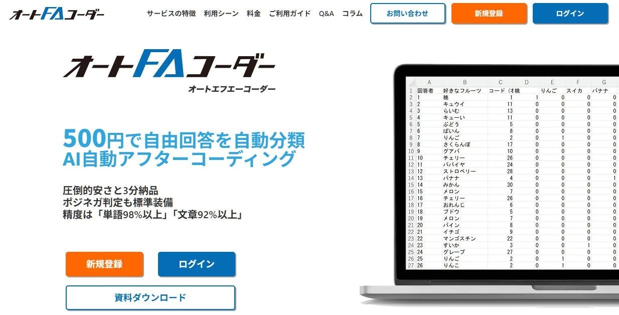 オートFAコーダーはアンケートの自由回答や各種テキストデータから共通項目を抽出するアフターコーディングを自動で行うWEBツールです。アフターコーディング業務の長年の課題であった「時間」、「費用」、「均質化」の問題をAIによって解決し、「短納期、低コスト、均質化の担保」を実現します。