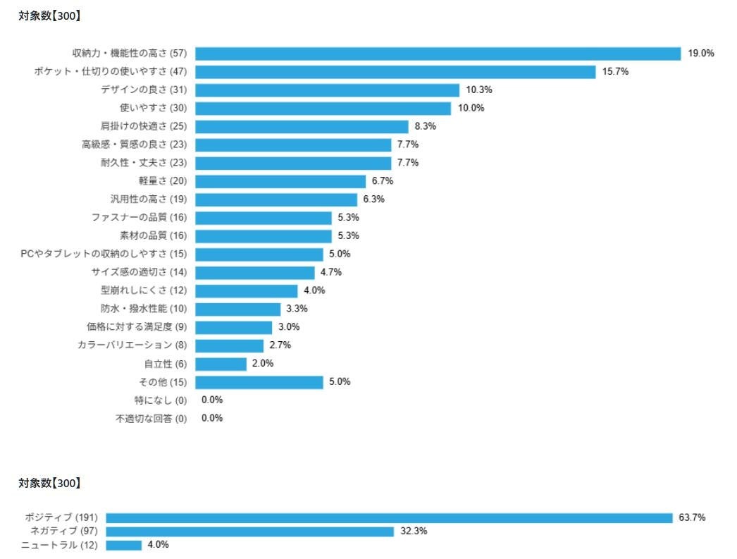 集計機能はコーディング結果の他にポジネガ判定(1)ポジティブ、2)ネガティブ、3)ニュートラル)にも反映され、また、単純集計の他にクロス集計も実施することができます。(例:男女別、年代別など)