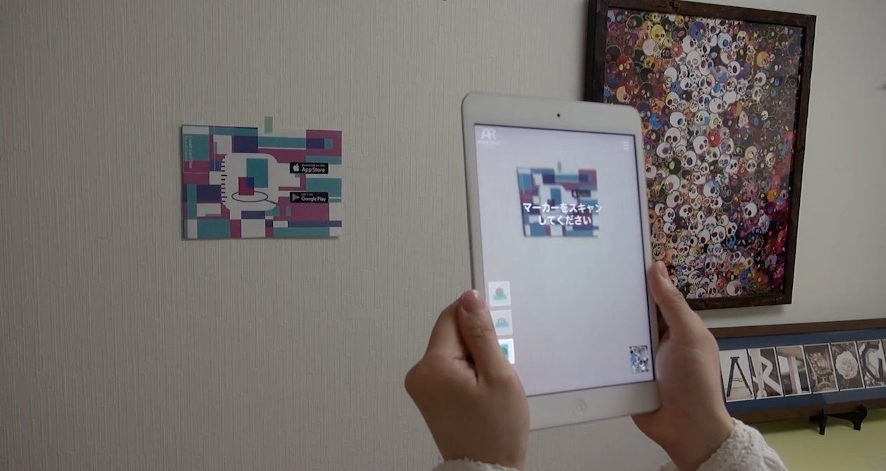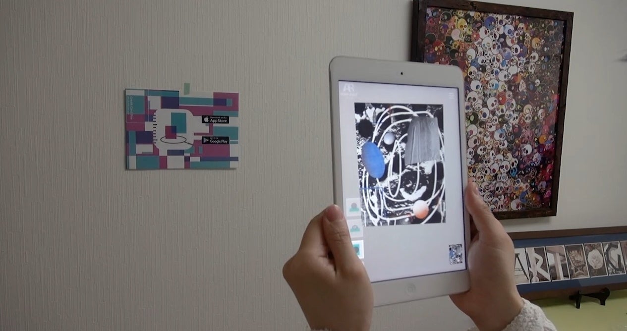スマートフォンのカメラを通じて映した現実の風景(アート作品を飾りたい場所)に、あらかじめ登録しておいたアート作品の画像を実物サイズで表示し、部屋に飾ったときの状態を実寸大で確認することができます。
