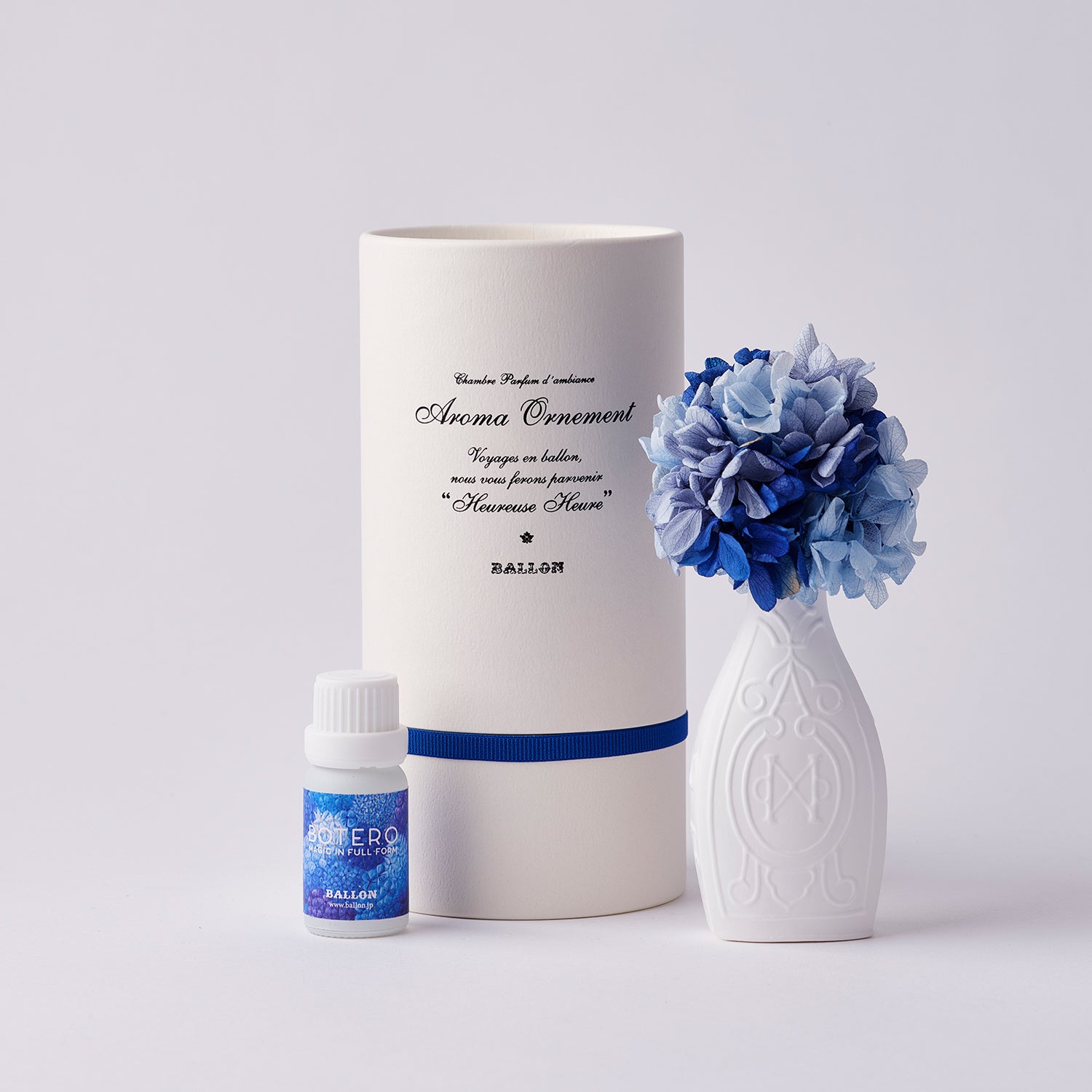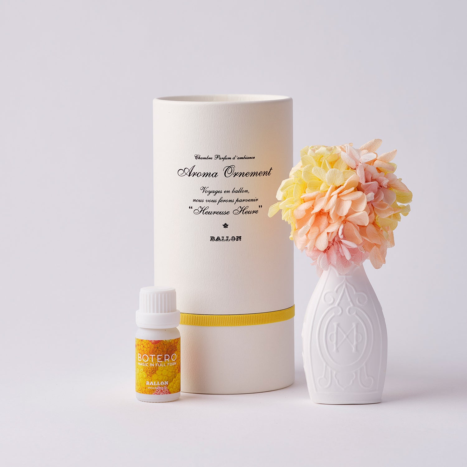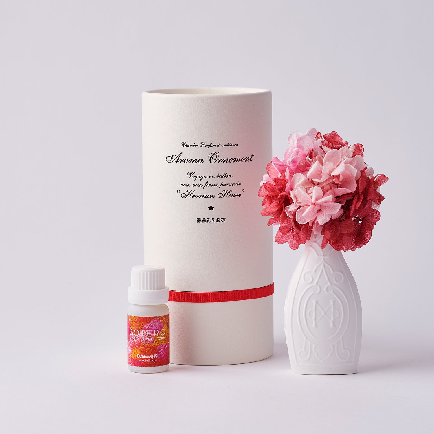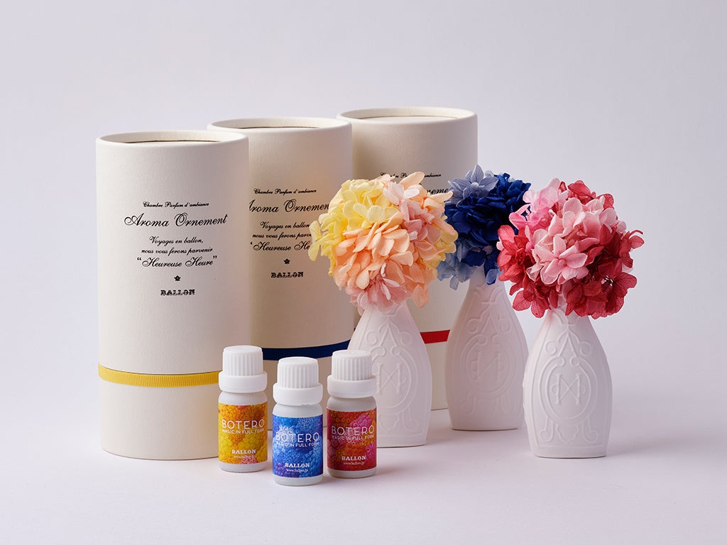 それぞれのアロマオーナメント®には、花の色から着想を得て、「赤の花」にはローズ、「黄色の花」にはジャスミン、「青の花」にはヴィオラの香りのBALLONオリジナルアロマオイルと、ボテロ展ステッカーが付属されます。