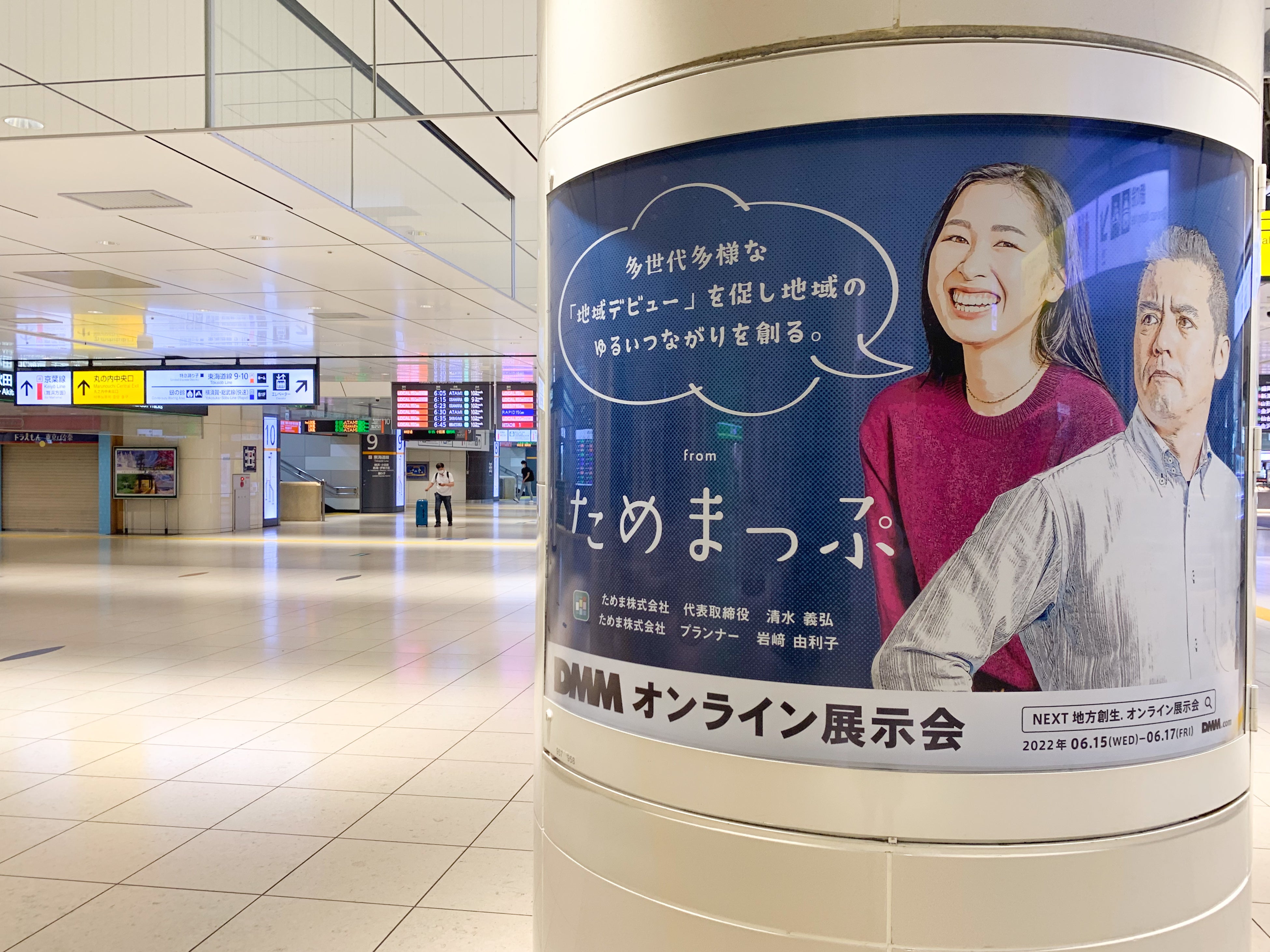 《合同会社DMM.com》(東京都港区、会長 兼 CEO 亀山敬司 以下、「DMM」)が展開するDMMオンライン展示会で、地方創生をテーマとした「NEXT地方創生.オンライン展示会」が2022年6月15日(水)〜6月17日(金)に開催されます。弊社は第一弾6月15日(水)12:00〜12:40の間に登壇。それに伴うプロモーションとして、地方創生に取り組む自治体・スタートアップ・一般社団法人など37団体44名の方との共創型広告が東京駅に本日より1週間(5月30日〜6月5日)掲出開始しました。