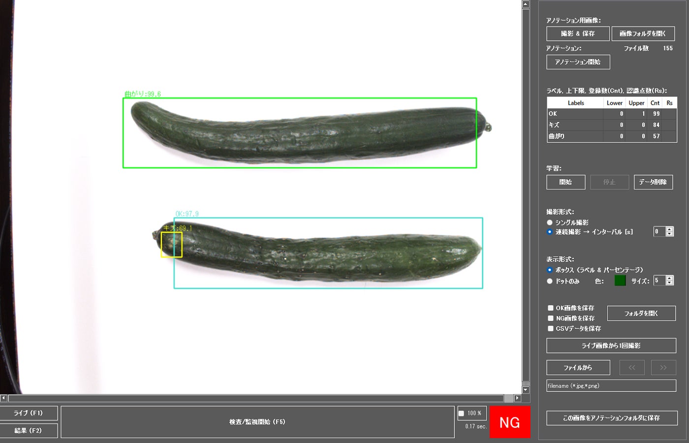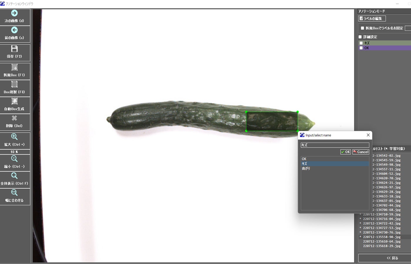 きゅうりの良品不良箇所を囲んで、学習をさせます。
