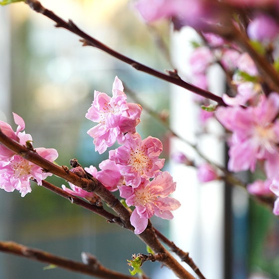 ふっくらとした蕾と、やわらかなピンク色の花が特徴の桃の枝。古くから春を象徴する花木として親しまれ、空間に明るく華やかな季節感をもたらします。花が咲き進む様子も楽しめるため、日々の変化を感じたい方におすすめの枝ものです。