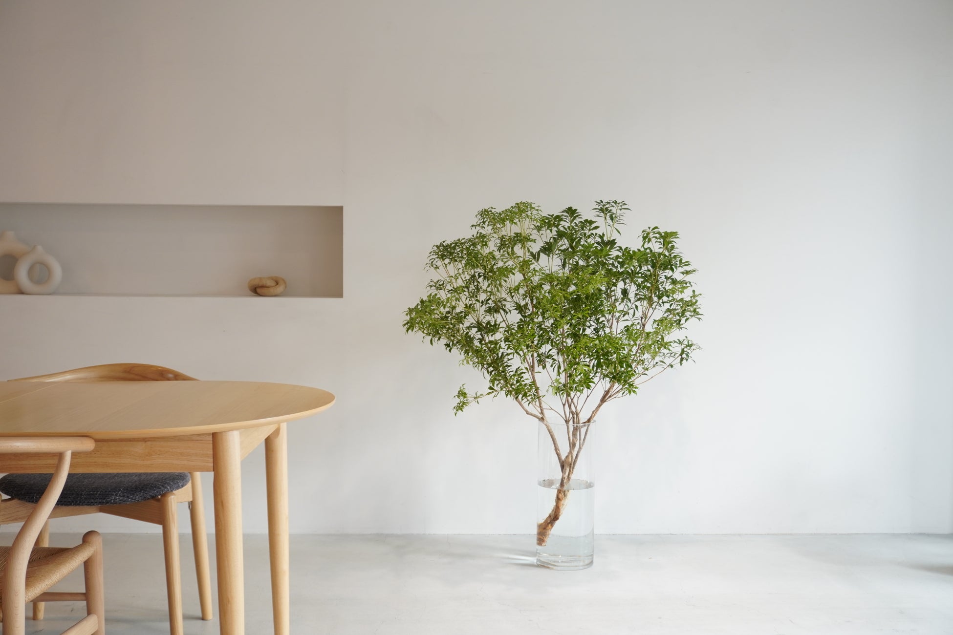 繊細な枝ぶりと小さな葉が美しいドウダンツツジ。シンプルで上品な佇まいは、モダンな空間にも和の空間にもよくなじみます。春先は芽吹きの様子を楽しめ、長く楽しめる点も魅力のひとつ。初めて枝ものを取り入れる方にも扱いやすい定番の枝ものです。