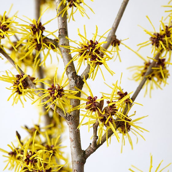 細く伸びた枝先に、独特の形をした花を咲かせる花万作。花びらのように見える部分はリボン状に広がり、静かな中にも個性を感じさせる佇まいが魅力です。早春の枝ものとして古くから親しまれ、空間に凛とした季節感と奥行きをもたらします。