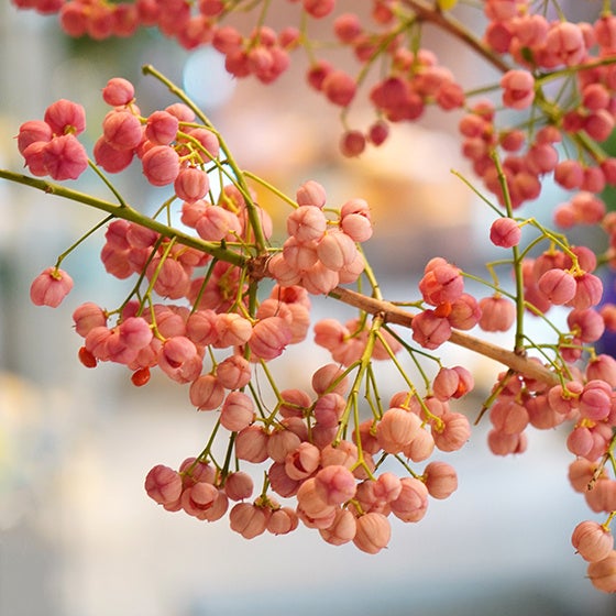すっと伸びる枝に、やわらかな色の実を実らせたマユミ。控えめながらも愛らしい表情で、空間にやさしい季節感をもたらします。枝ぶりの美しさと実ものならではの趣を楽しめる、上質な枝ものです。