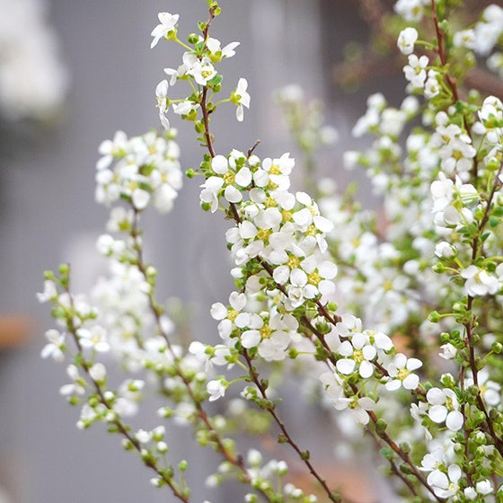 細くしなやかな枝に、小さな白い花をたくさん咲かせる雪柳。花瓶に活けるだけで空間に軽やかな動きを与えてくれます。可憐でやさしい印象ながら、和洋どちらの空間にもなじみやすく、春の訪れを感じさせる代表的な枝ものです。