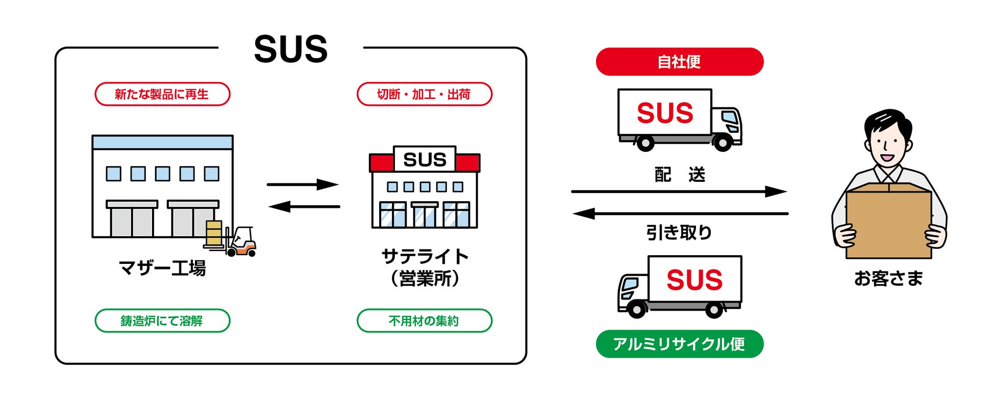 また、SUSではお客さまへのラストワンマイルを担う独自の取り組み、「自社便配送」を展開しています。深刻化する運送業界の人手不足など、物流業界の課題に対応し、お客さまへ安定して製品をお届けするための、当社独自のデリバリー体制です。このたび本格始動する「アルミリサイクル便」は、自社便配送を活用し、製品の配送と不用材の引き取りを同時に行う、効率的で環境に優しいサービスです。製造から配送・引き取り・再生までを一貫体制で担う、当社独自の水平リサイクルスキームにより資源循環を加速させ、脱炭素社会の実現に貢献します。