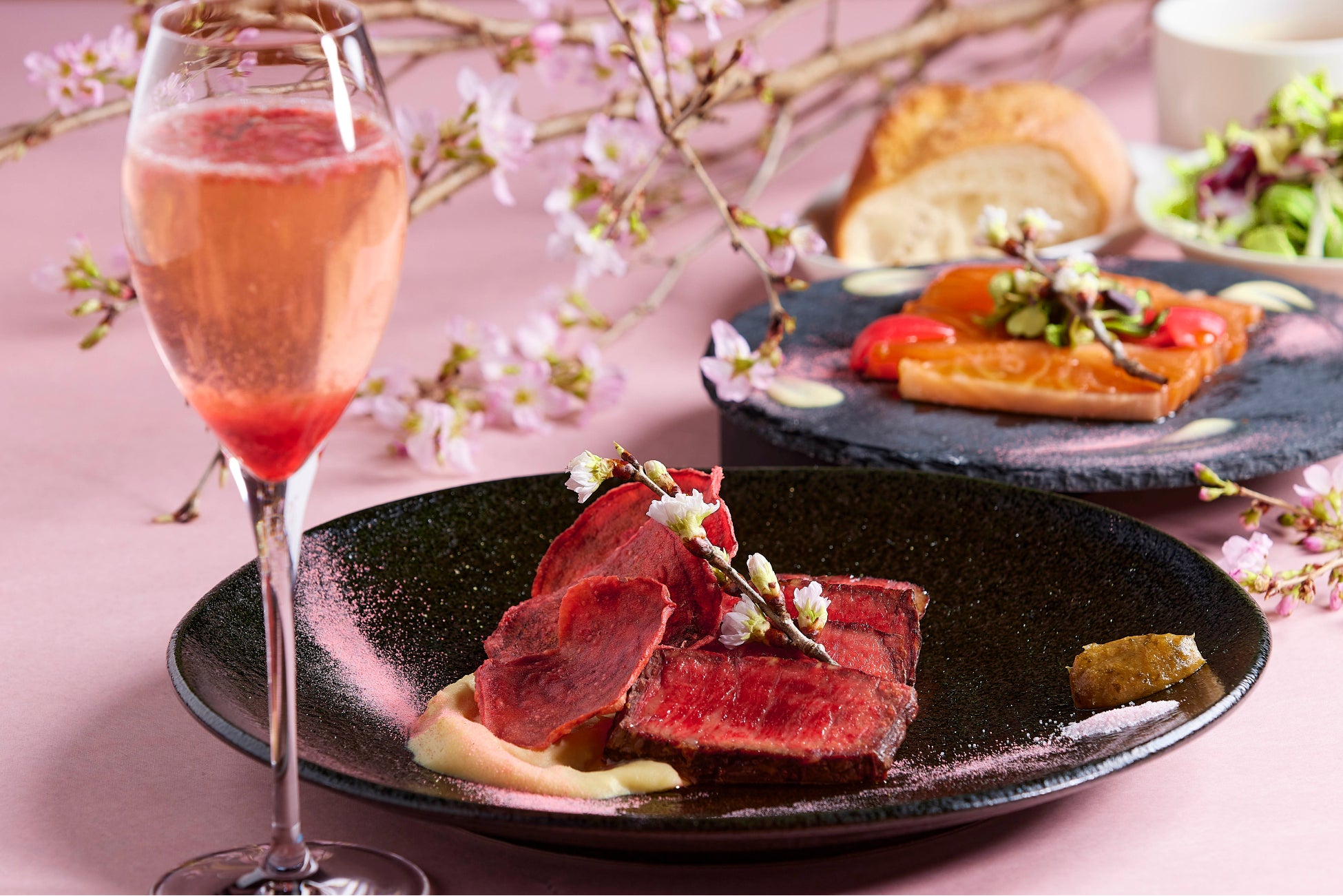 イタリア中部のトスカーナ地方で生まれた肉料理、タリアータ。志方牛を厚めにスライス、桜風味の塩、春らしい甘さが漂う桜の葉とルバーブのジャムを添えて二種類の桜の味覚がお楽しみいただけます。さらに優しい甘さのじゃがいものピュレが志方牛の赤身肉の旨味を引き立てます。イタリア修行を経たシェフが磨きぬいた技で“桜”を表現したメニューです。