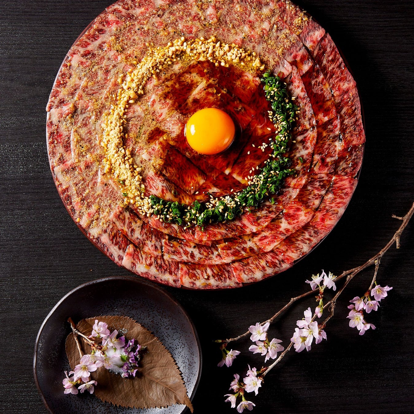 日テレ『ゼロイチ』で放映されて話題沸騰中の「シルクユッケ」を桜葉と桜の塩漬け・桜塩とともに。新鮮な極上霜降り肉を薄くスライスした“シルク”のような口当たりが好評。甘いサシの旨味を引き立てる特製の塩味・タレ味と卵黄のハーモニーに桜の風味が加わった逸品です。