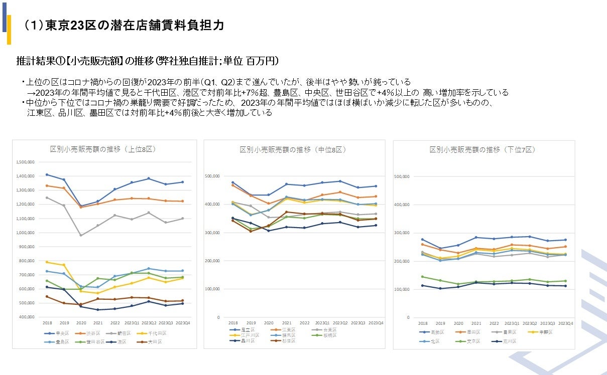 本マーケットレポートは、2023年10月にプレスリリース致しました第1弾の続編と致しまして、2023年第4四半期までの更新されたデータをもとに、賃料の源泉となる小売販売額水準の時系列推移について、東京23区内の各区別の動向を推計したものです。