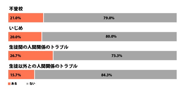 一方、不登校やいじめの経験、人間関係のトラブルにあった経験が「ある」という方も少なからずいるようです。いじめや不登校の原因となる可能性がある「生徒間の人間関係のトラブル」は28.0%の方に経験があることがわかりました。また、身近な方の経験では5人に1人に不登校やいじめの経験があるようです。いじめや不登校は遠い世界のものではなく、身近な問題であると言えそうです。
