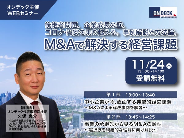 M&A仲介・アドバイザリーの株式会社オンデック(代表取締役社長:久保良介)は、経営課題を解決するためのM&Aの活用についての無料オンラインセミナーを、11月24日(木)13:00~14:30に開催します。