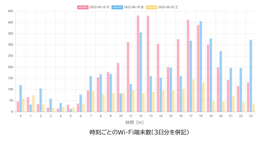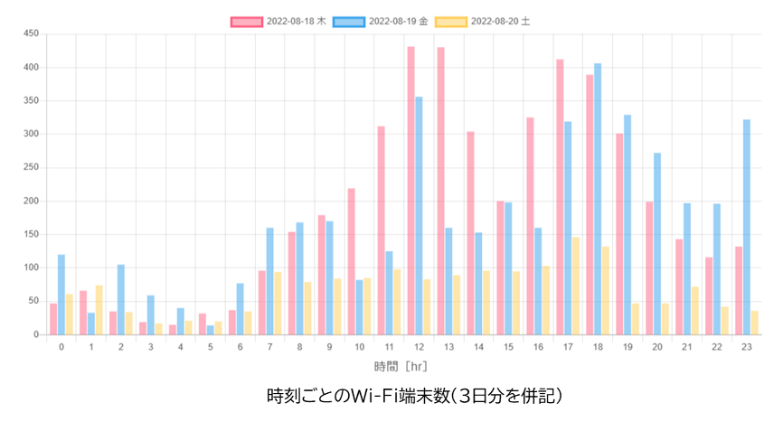 センサー近傍にいる人数(無線LAN端末所有者)の増減傾向がわかるため、店舗やイベント会場など多くの利用者が行き交う場所で、場所や時間によってその混雑度がどのように変化するのかを推測することが可能となります。