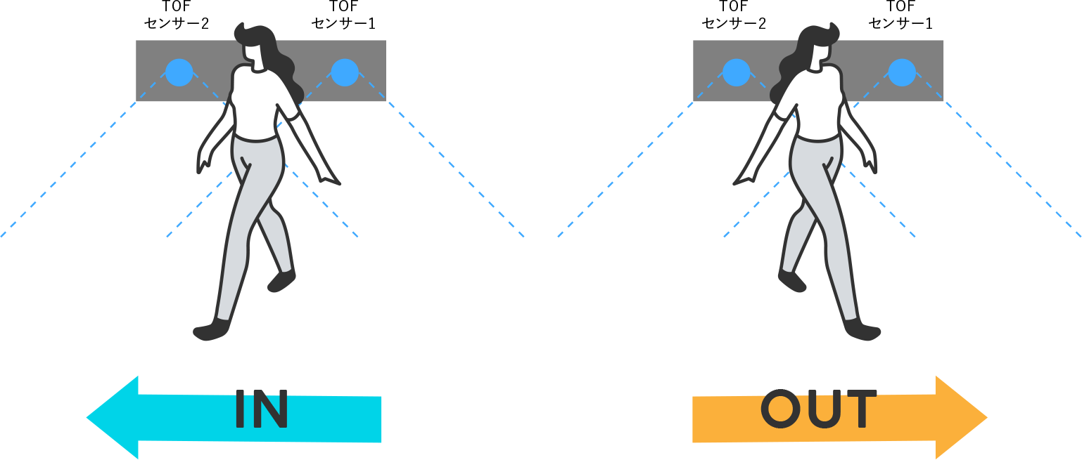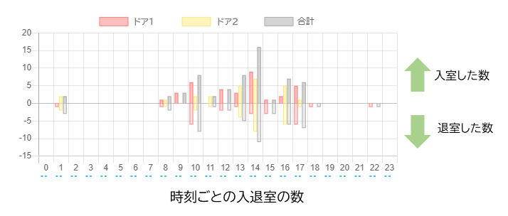 センサーの前を通行した向きも検知できるため、入室/退室の数を差し引くことで、その時点で室内に何人の方が滞在しているのか、おおよその数を推測することが可能となります。