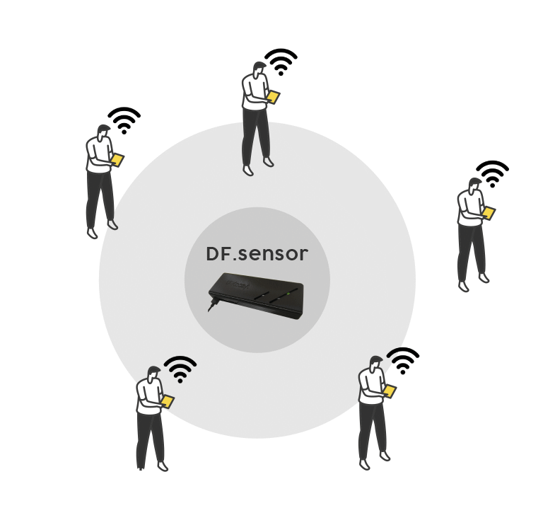 重さ約200gほどの片手で持てるコンパクトサイズです。混雑度を計測したい場所の近傍であれば人目につかない場所に設置してもOKです。データはクラウドに送信されますが、DF.sensor本体にインターネット接続モジュール(SIM)を装着しているため、家庭用電源コンセントに挿すだけですぐにご利用いただけます。