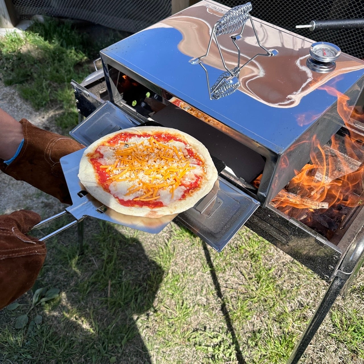のせて、焚き火で焼く、本格的なマルゲリータピザ。