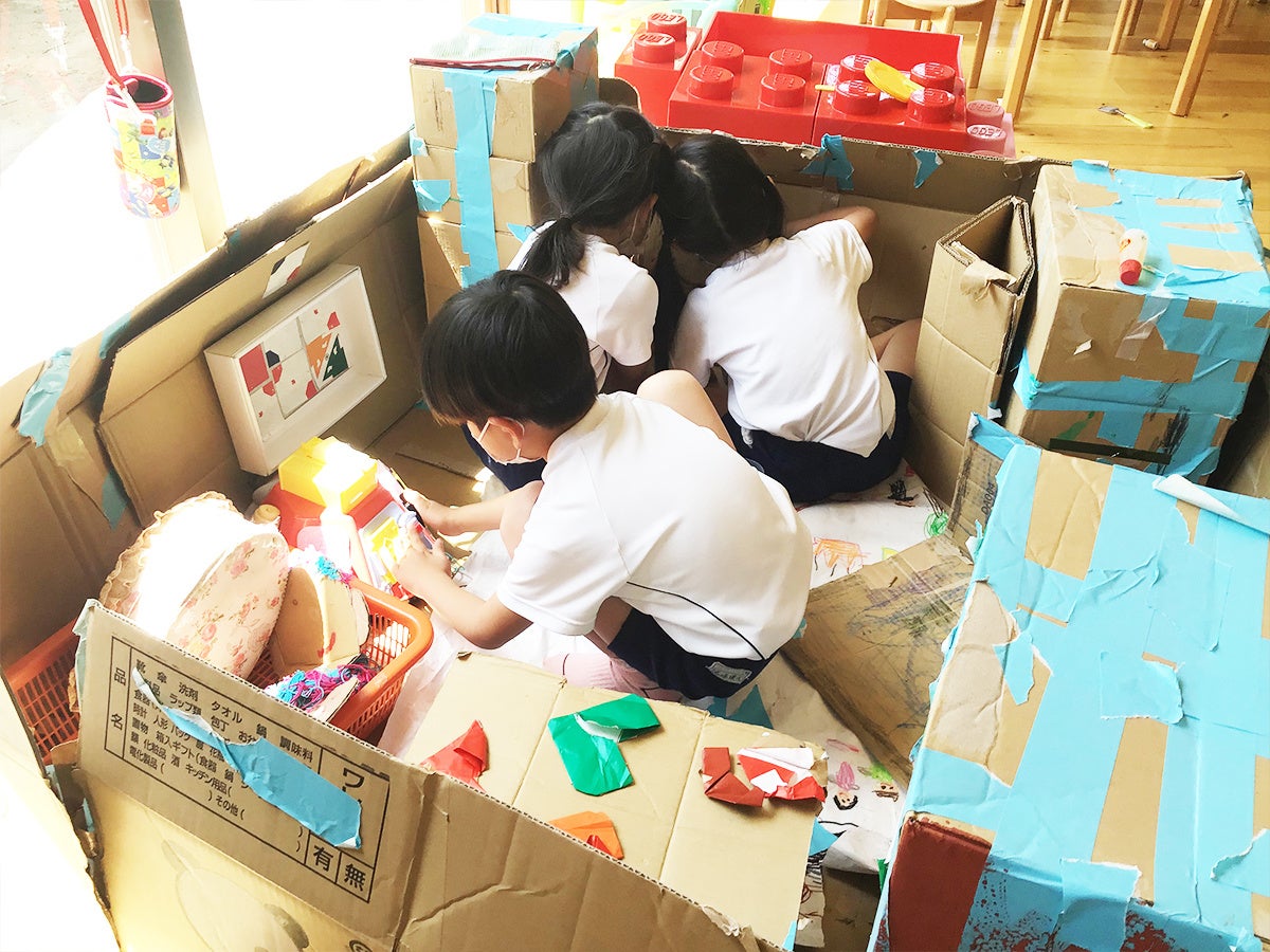 女の子たちの遊ぶ姿を見ていた男の子グループが徐々に興味を持ち始め、男女で一緒にごっこ遊びをするようになりました。また、多数の子どもたちが遊びたがったため、保育者からの要望を受けて2体を追加し、合計3体になりました。数が増えたことで「ぽぽちゃんたち3人のお家を作りたい」という共通テーマが子どもたちの間で生まれ、1.5㎡のダンボールハウス制作がスタートしました。