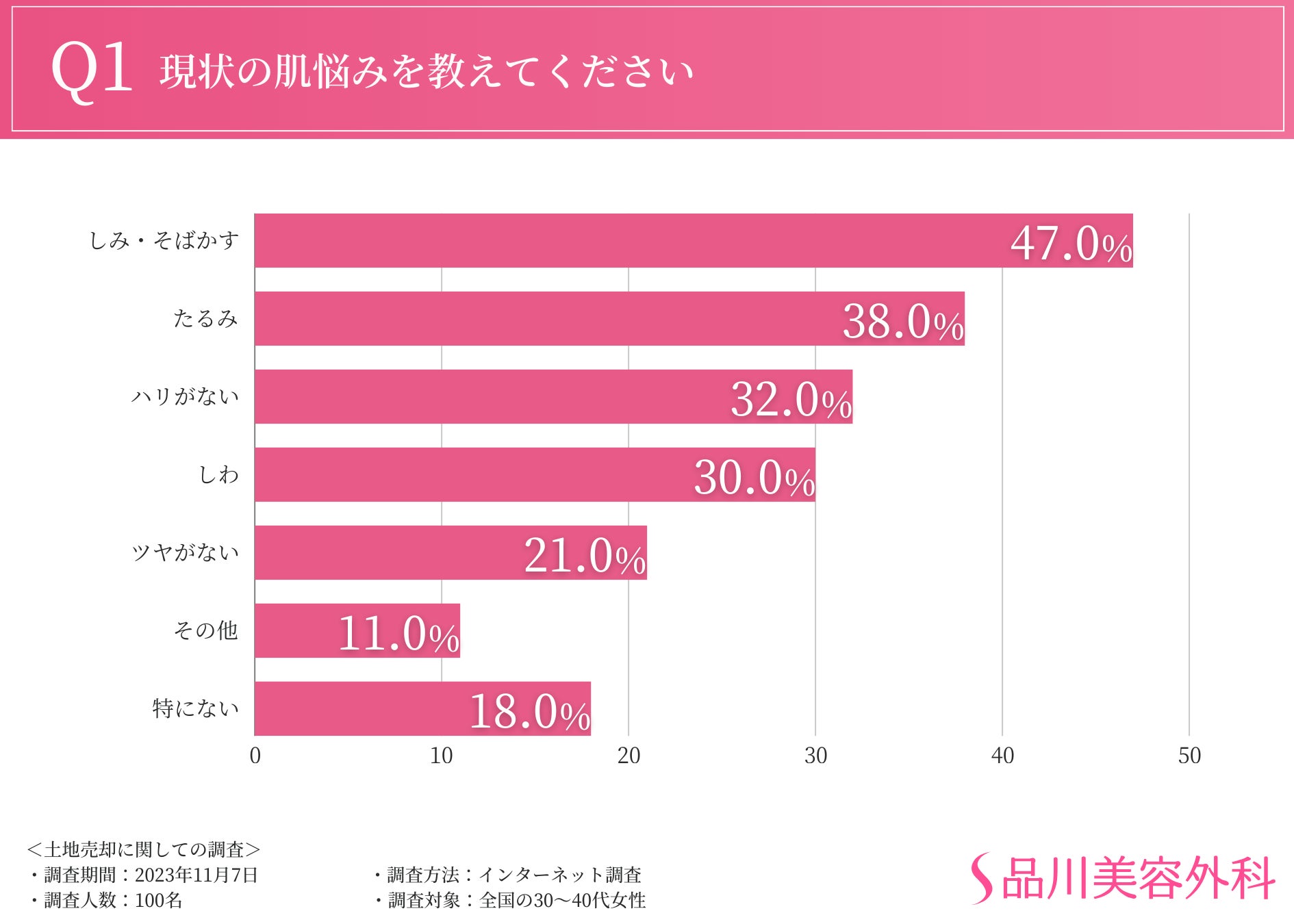はじめに、現状の肌悩みについて伺ったところ、「しみ・そばかす(47.0%)」と回答した方が最も多い結果となりました。