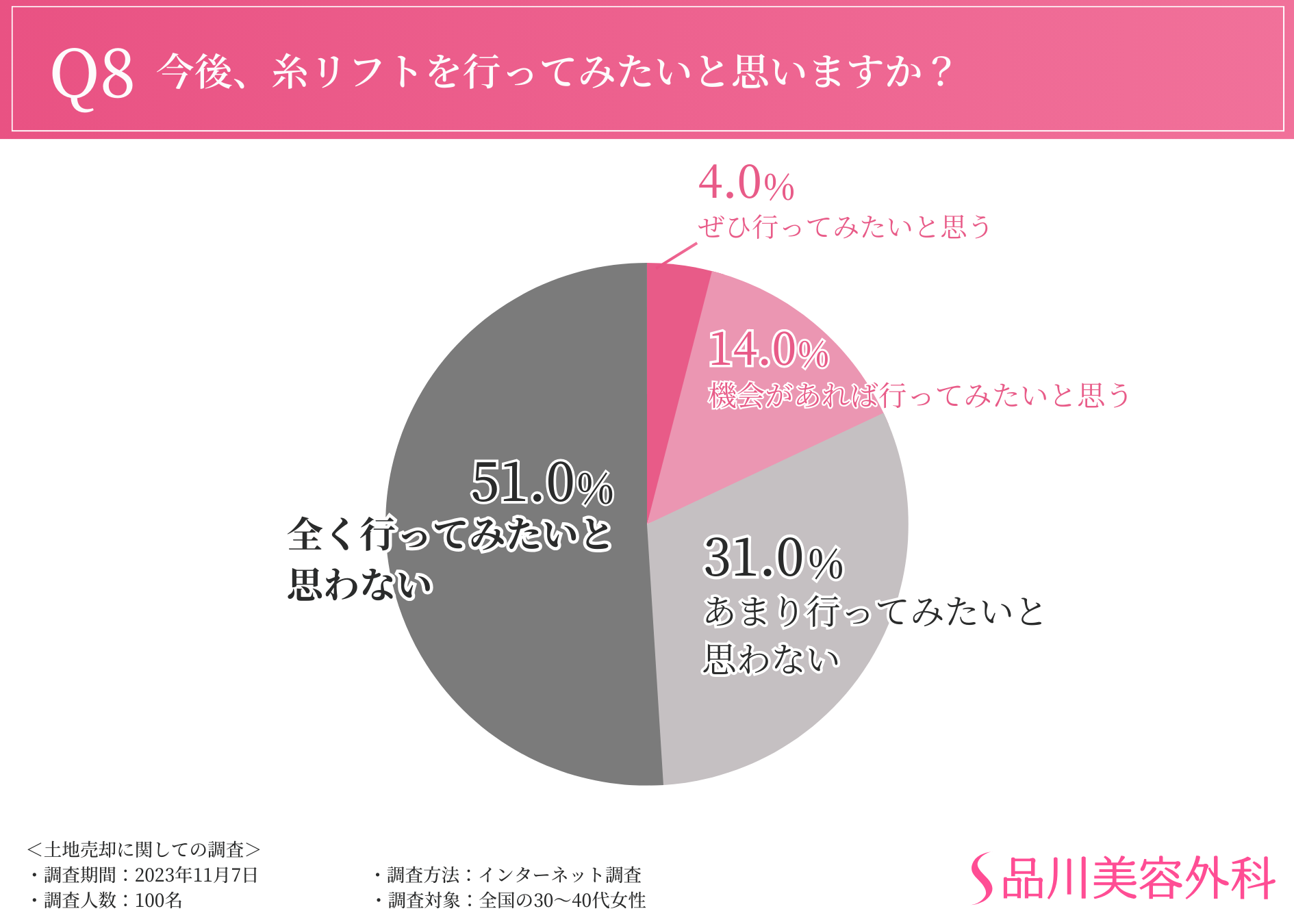 また、糸リフトに関しては、約6割の方は聞いたこともないという結果となり、認知度もまだ低いことがわかる結果となりました。