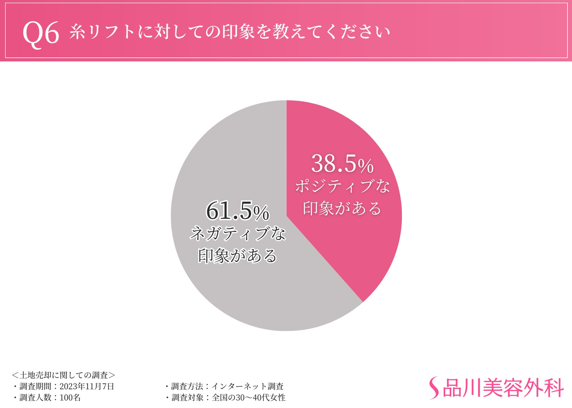 糸リフトを知っている方を対象に、糸リフトに対しての印象について伺ったところ、「ネガティブな印象がある(62.0%)」「ポジティブな印象がある(38.0%)」という結果となりました。