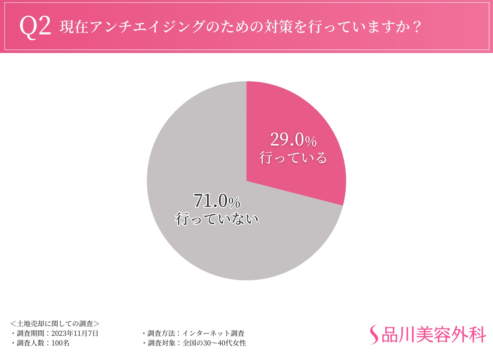 現在、アンチエイジングのための対策を行っているか伺ったところ、「行っていない(71.0%)」「行っている(29.0%)」という回答結果となりました。