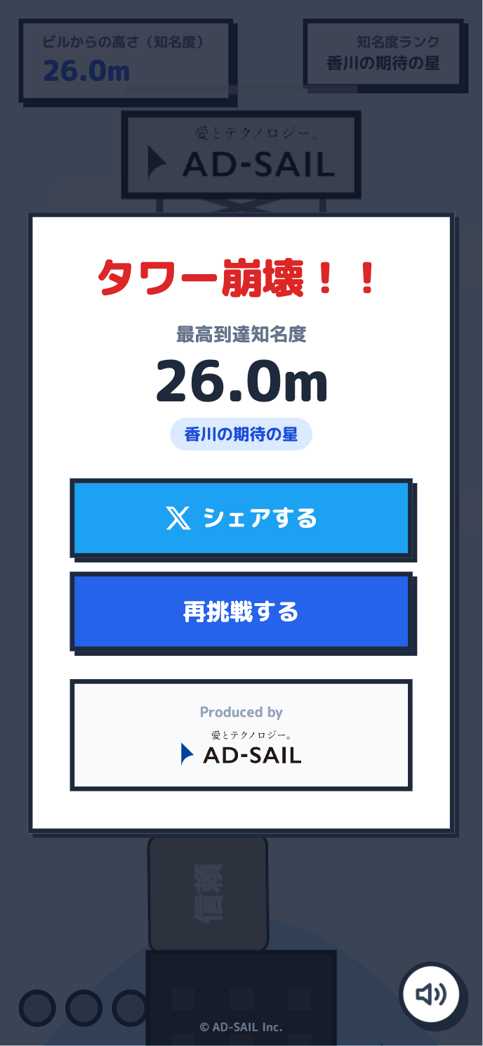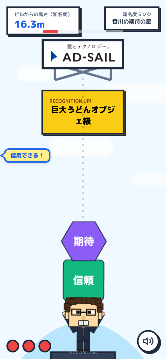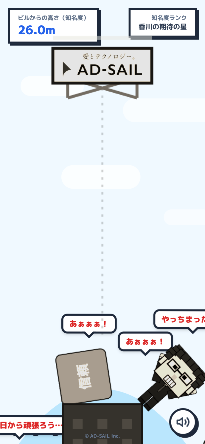 香川県高松市を拠点にマーケティング事業を展開するアド・セイル株式会社(本社:香川県高松市、代表取締役:川添 泰史)は、「仕事は高評価なのに、世間には名前や実績が知られていない」という当社の切実な課題を打破するため、社長や社員、そして企業理念をブロックに見立てて高く積み上げるブラウザゲーム『アド・セイル知名度積み上げタワー』を自社開発し、無料公開いたしました。