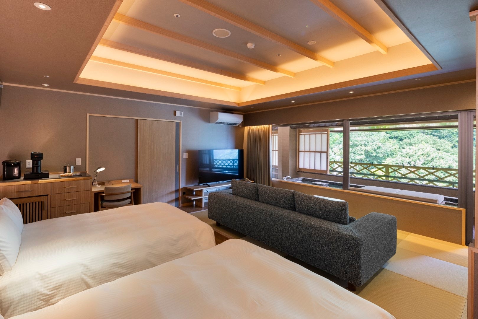 リニューアルした足湯で癒されたあとは、客室でゆったりと。