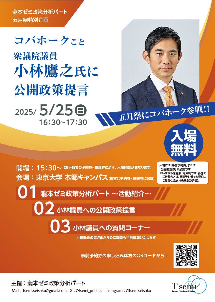 東京大学の瀧本ゼミ政策分析パート(代表:永井 優樹)は、2025年5月25日(日)に東京大学本郷キャンパスで行われる五月祭にて、「小林鷹之氏への公開政策提言会」を開催いたします。ゲストに開成中学・高等学校・東京大学・ハーバード大学を経て、昨年9月の自民党総裁選にも出馬された衆議院議員 小林 鷹之氏を迎え、現役大学生であるゼミ生が考案した施策を提言。本イベントは参加費無料です。参加申し込みは、以下のページからの事前予約(200名限定/500名定員)か、当日10時からの本郷キャンパス医学部1号館前での整理券配布にて可能。