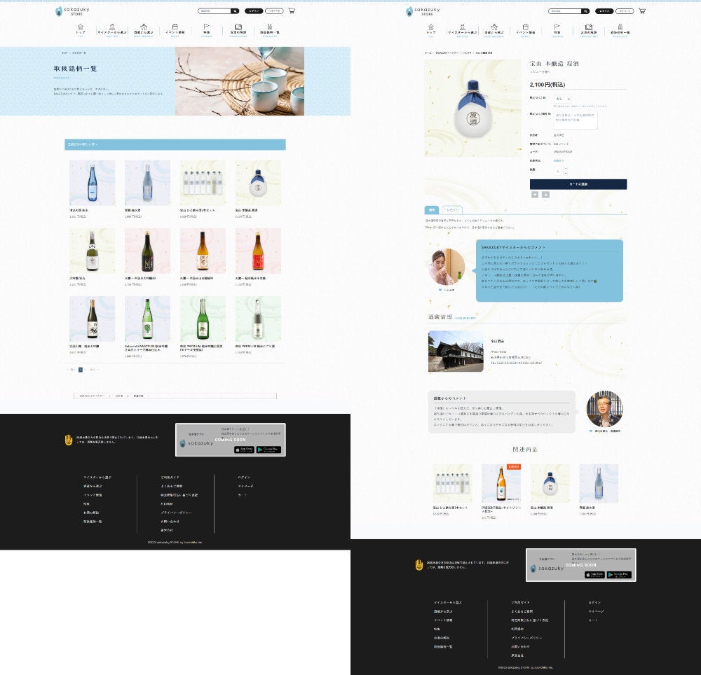 このため、WordPress側の「sakazukyマイスター」や蔵元の各ページには、CS-Cart Multi-Vendorに入っている関連する商品情報を表示して商品が購入できる導線を設け、CS-Cart Multi-Vendor側には、WordPressに入っている「sakazukyマイスター」のコメント、や蔵元の情報やコメントが表示されるカスタマイズを行っています。