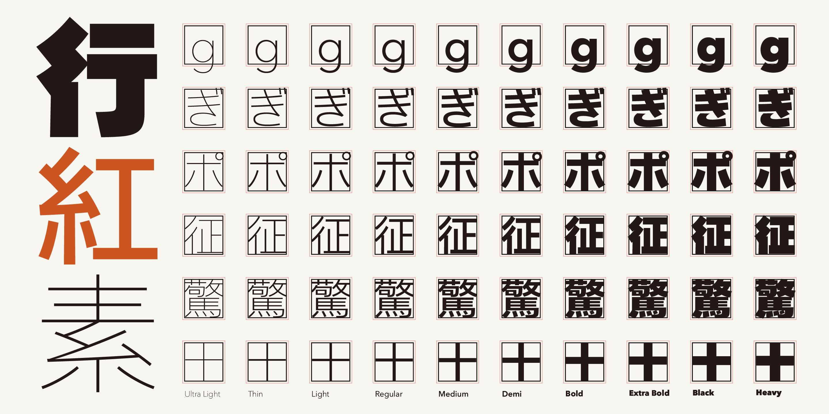 和文書体Adobe-Japan 1-3(OpenType StdN)/和欧混植対応/10ウェイト(Ultra Light、Thin、 Light、Regular、Medium、Demi、Bold、Extra Bold、Black、Heavy)/バリアブルフォント/デスクトップ、Webフォント、ePub、HTML5を使用したデジタル広告などの各種ライセンスを提供。