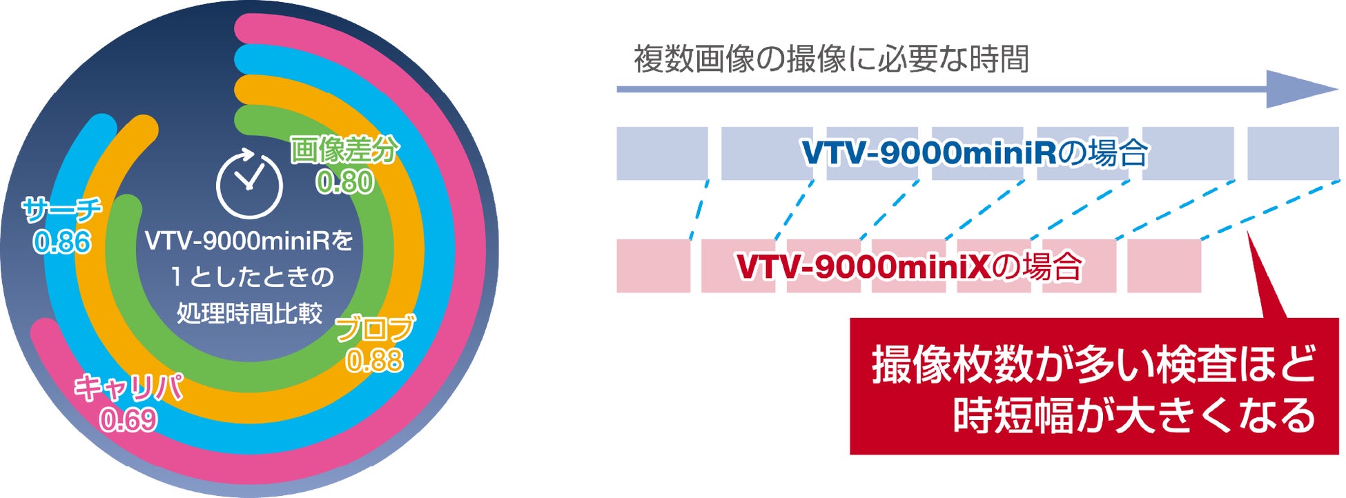 現行の高速モデル「VTV-9000miniR」を1としたときの処理時間はおよそ0.81。123%の高速化をしています。特にキャリパ検査は0.69まで高速化されています。