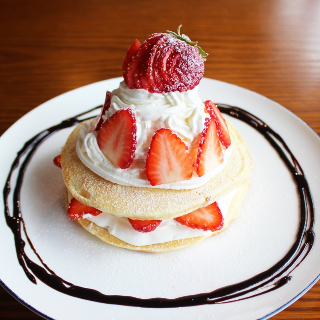 生クリームをはさんだパンケーキ生地3枚に「苺チョコクリーム」をたっぷりとかけ、「まりひめ」を贅沢にちりばめたパンケーキです。