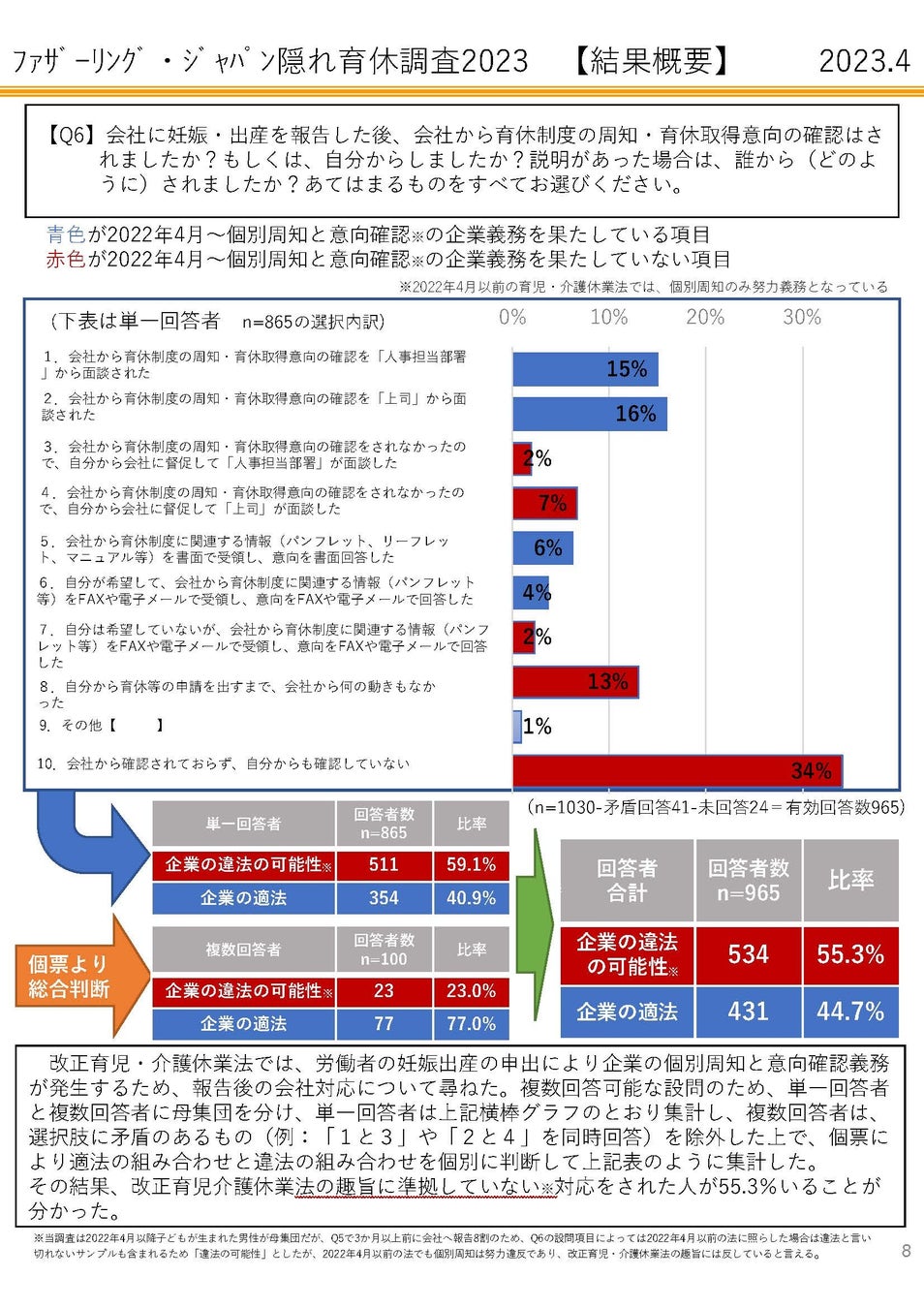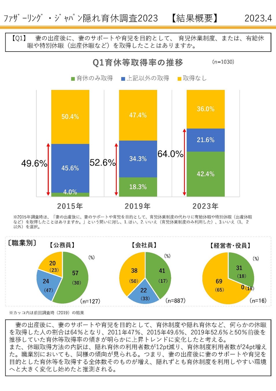 「隠れ育休調査2023」調査結果【速報版】発表!改正育児・介護休業法の趣旨違反は55.3%、育休等取得率は64%に上昇も両親学級未受講男性が6割超。異次元少子化対策前に現行の徹底推進が不可欠。