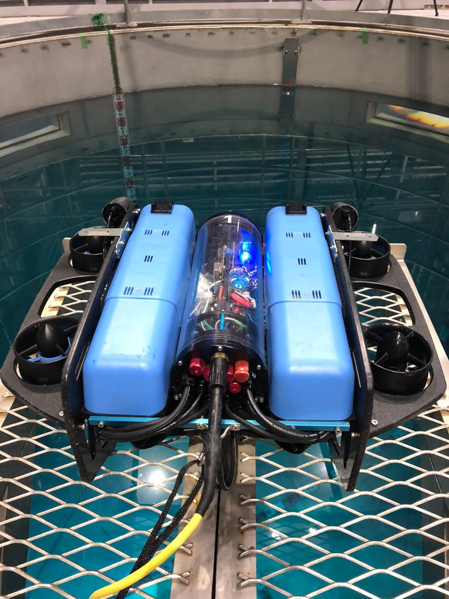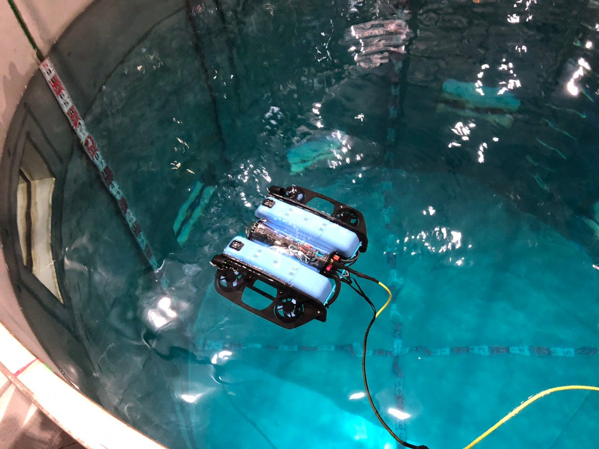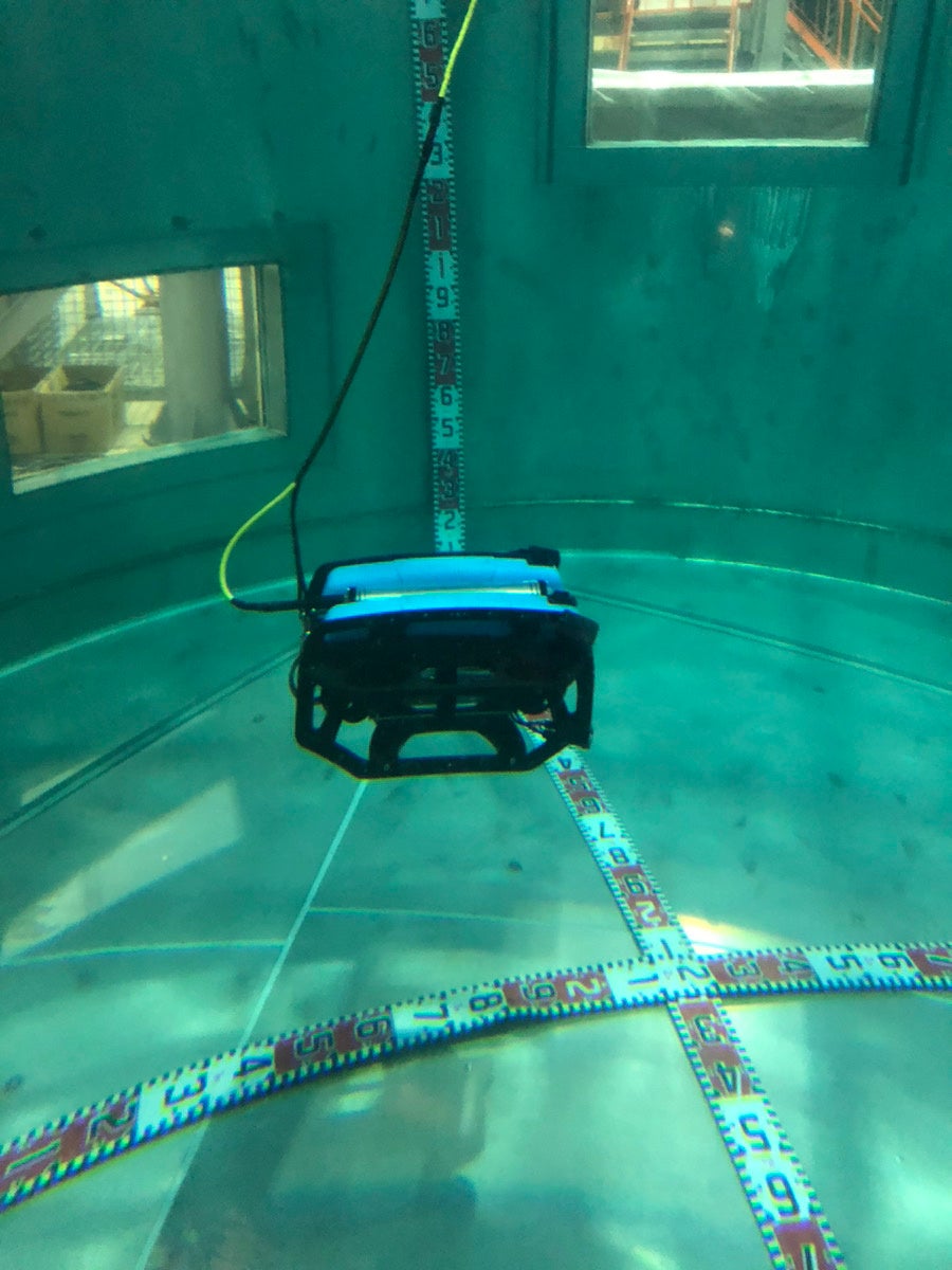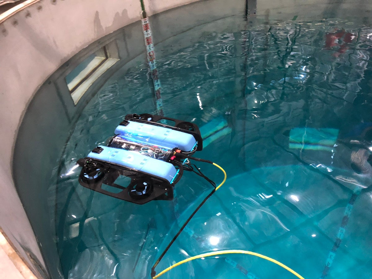 ここは浅いプールですので機体の動きは限定的ですが、BlueROV2という機体がどのような動きをして、それらを動かすにはどのような装備が必要なのお見せします。