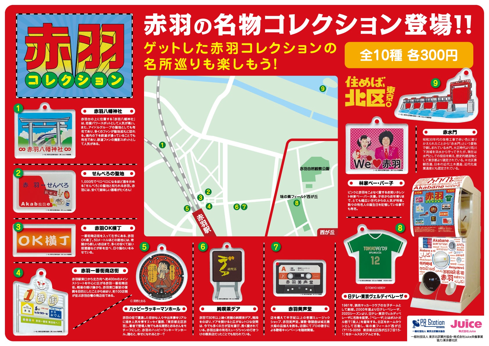 一般社団法人 東京北区観光協会(東京都北区)と株式会社Juice(東京都豊島区)は共同企画により、11月27(日)より赤羽の魅力を集めたアクリルキーホルダーのカプセルトイ「赤羽コレクション」を一般発売いたします。種類は全10 種類。地元の人や赤羽好きなら誰もが知っている人物やスポット、知る人ぞ知るお店までさまざまな赤羽の魅力をコレクションしています。