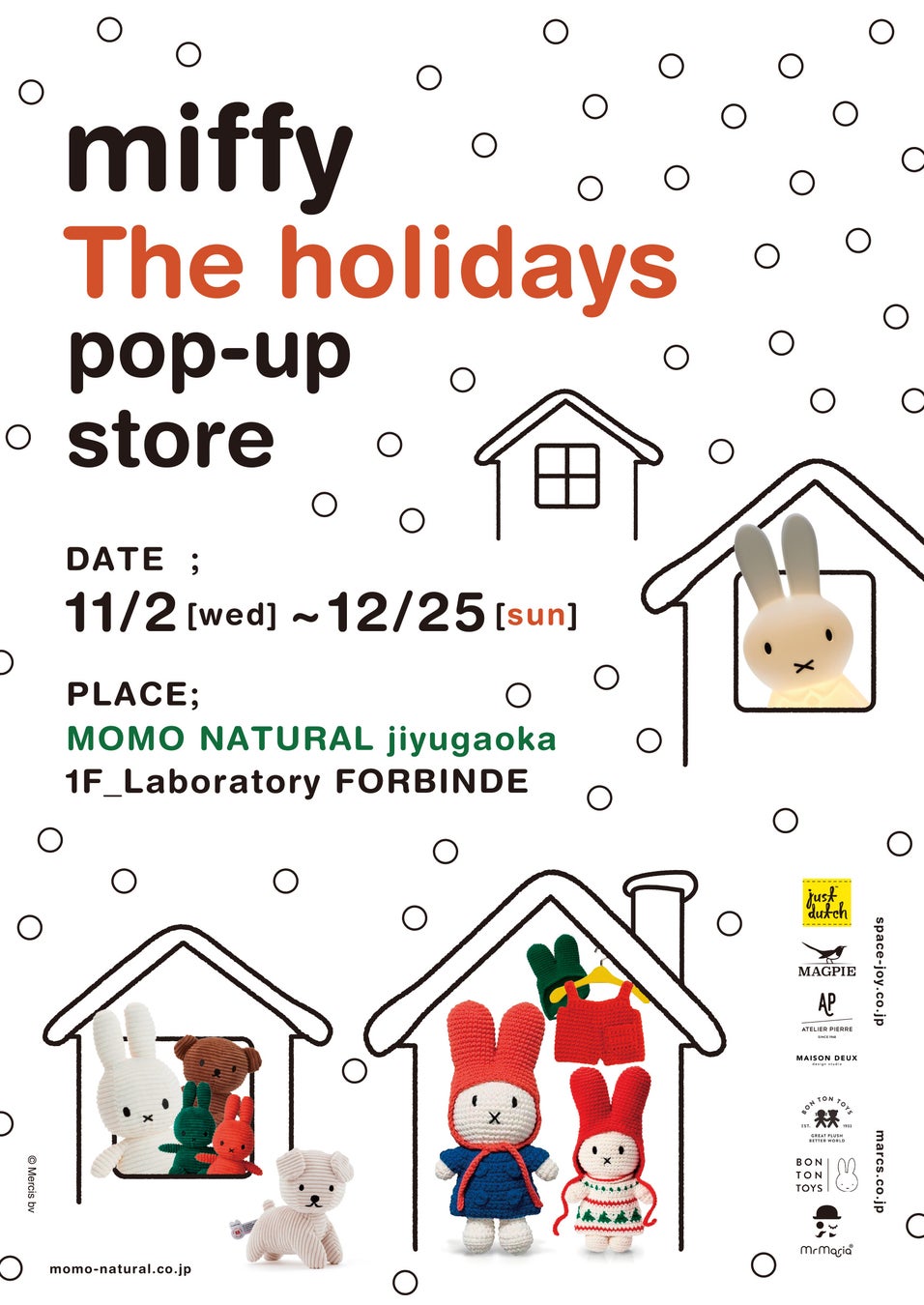 MOMO NATURAL 自由が丘店併設の"FORBINDE(フォビンド)"では、11月2日(水)~12月25日(日)の期間、"Miffy -The holidays- pop-up store"と題し、クリスマスシーズンの到来に合わせて、ミッフィーのアイテムを集めたポップアップイベントを開催いたします。