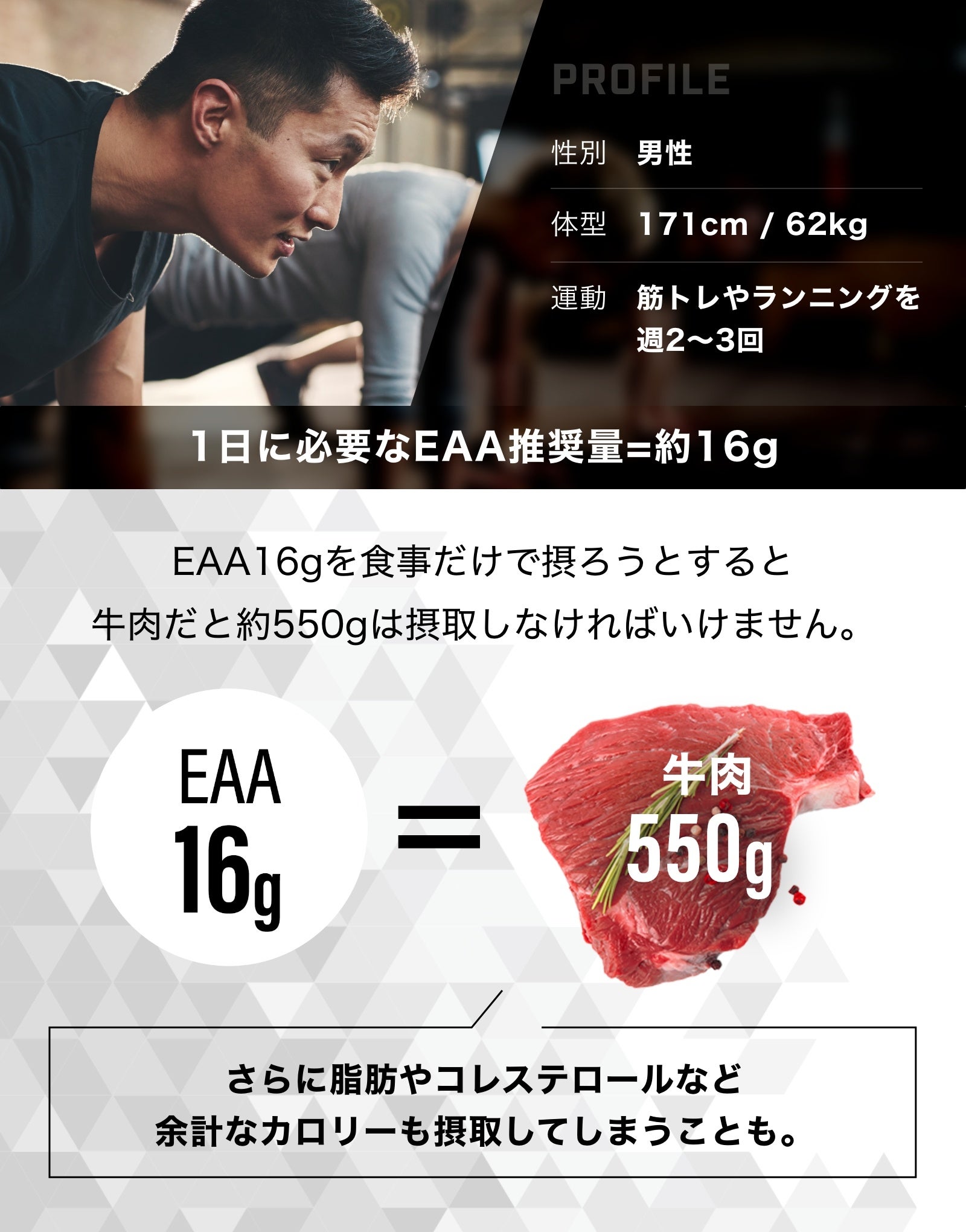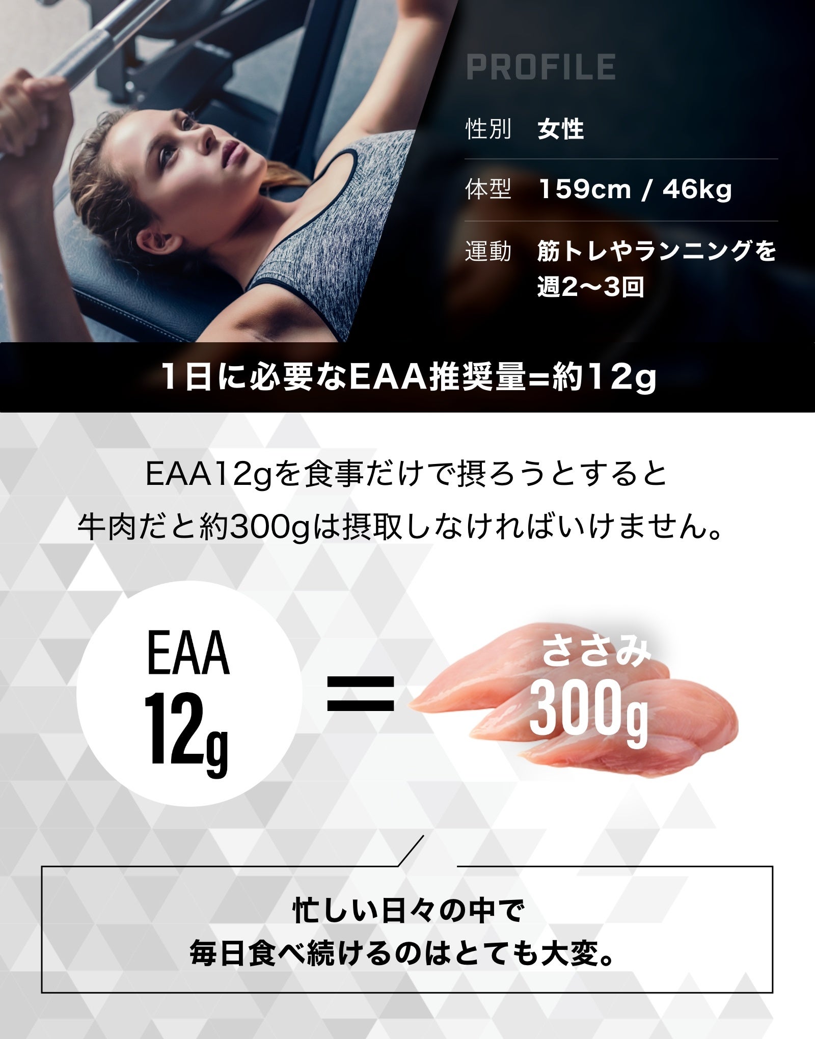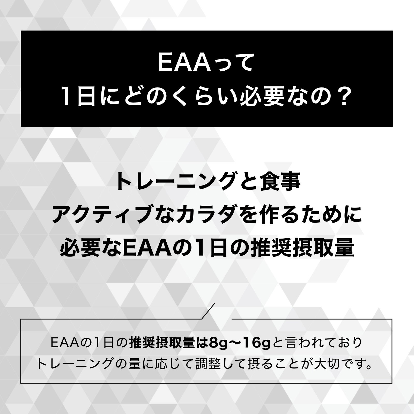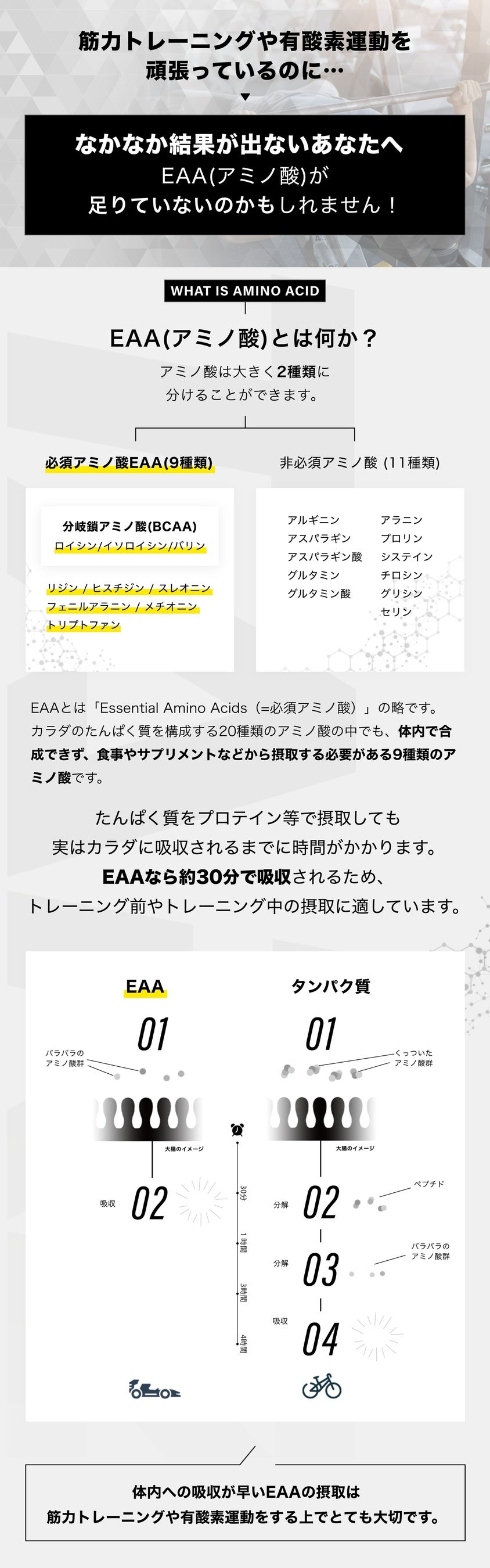 「Essential Amino Acids(=必須アミノ酸)」の略です。カラダのたんぱく質を構成する20種類のアミノ酸の中でも、体内で合成できず、食事やサプリメントなどから摂取する必要がある9種類のアミノ酸です。