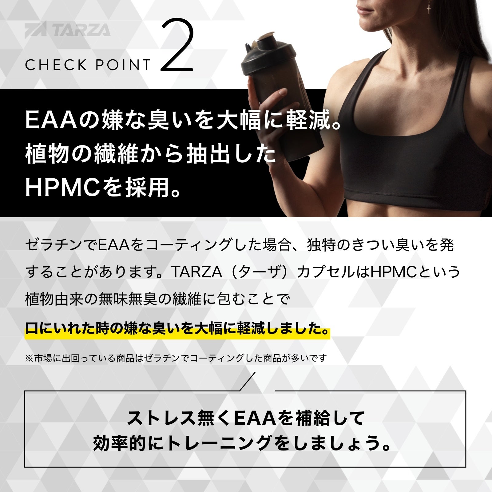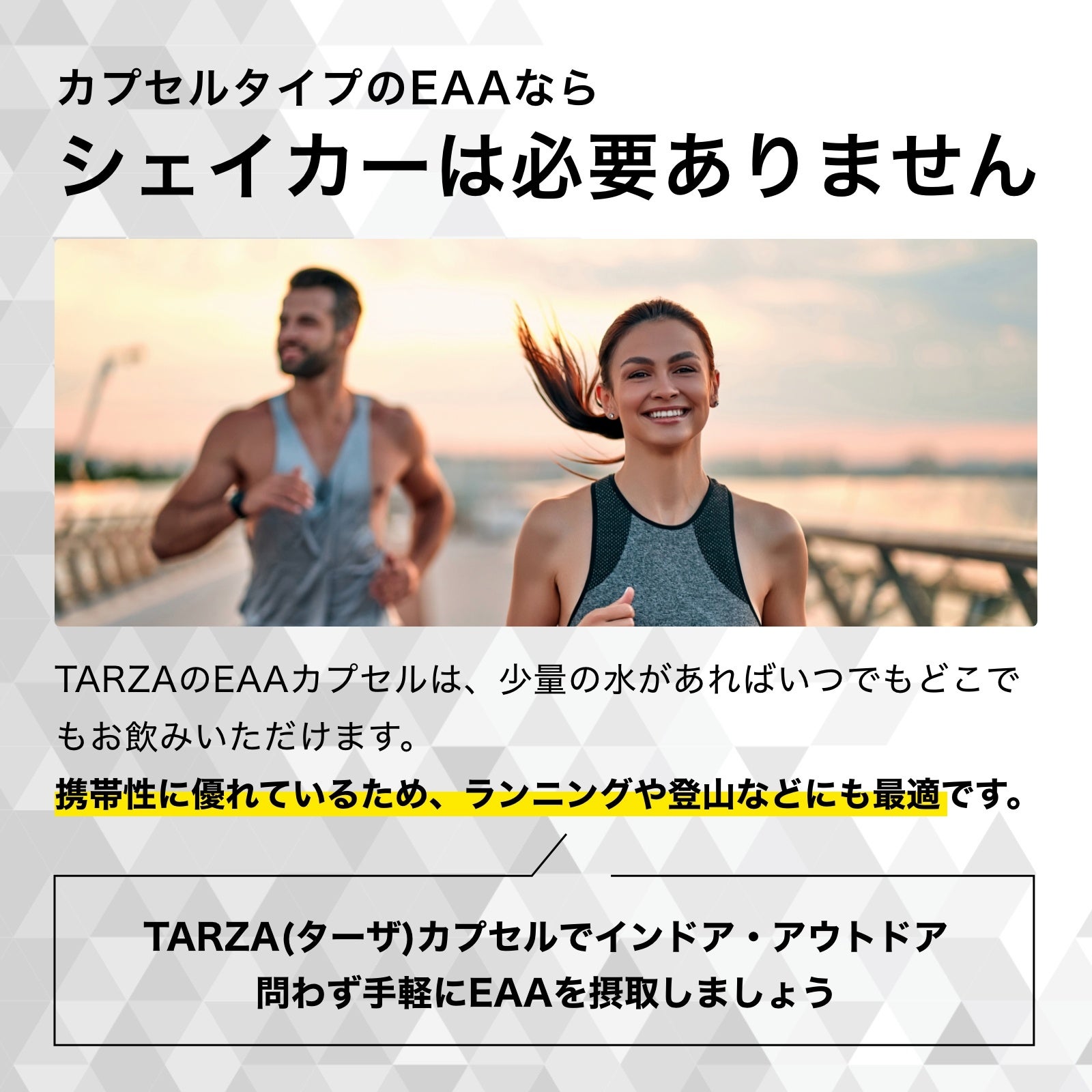 TARZA(ターザ)は販売累計15万食を突破した国産のスポーツ食品ブランドです。国内EAA市場はパウダー製品が多く、甘味料や着色料が気になるのが現状です。TARZA(ターザ)EAAカプセルは、520粒入りの大容量で、ほぼ無味無臭、合成甘味料と着色料不使用、日本人に合った小さめサイズのカプセルを採用しました。
