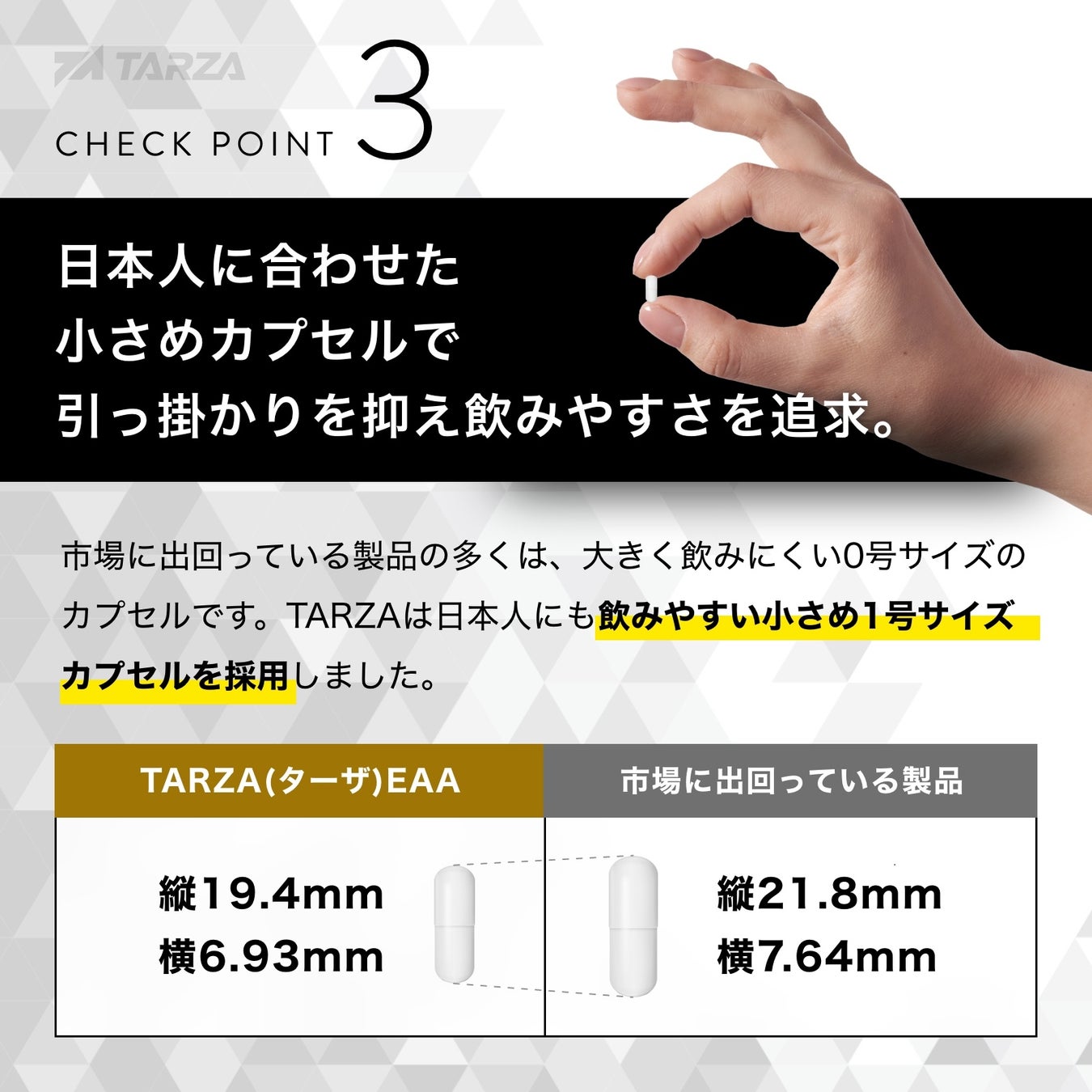 海外製品や国内で出回っているカプセル製品の多くは、サイズの大きい0号を採用しています。TARZA(ターザ)のEAAカプセルは多くの日本人が飲みやすいよう、小さめの1号サイズカプセルを採用しております。