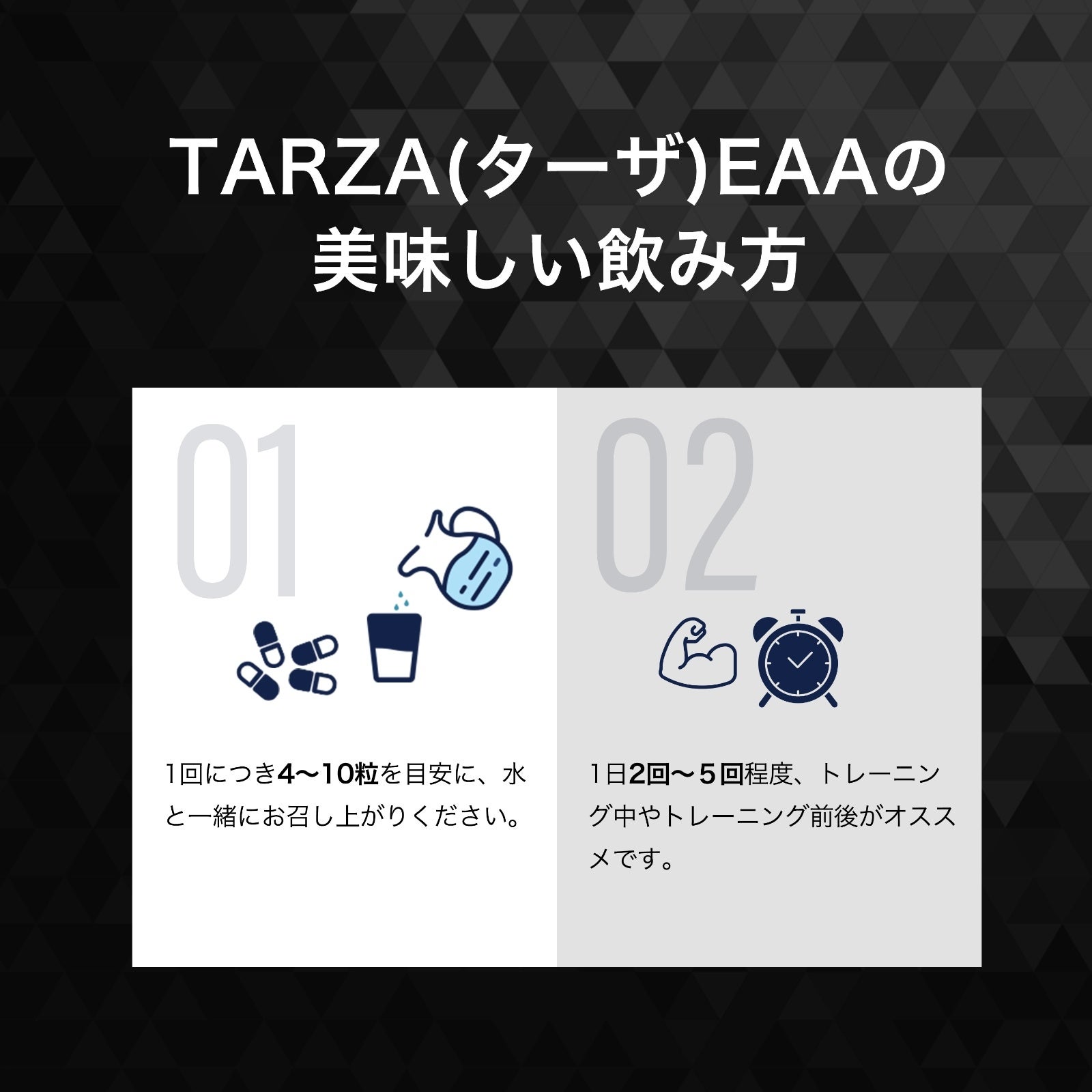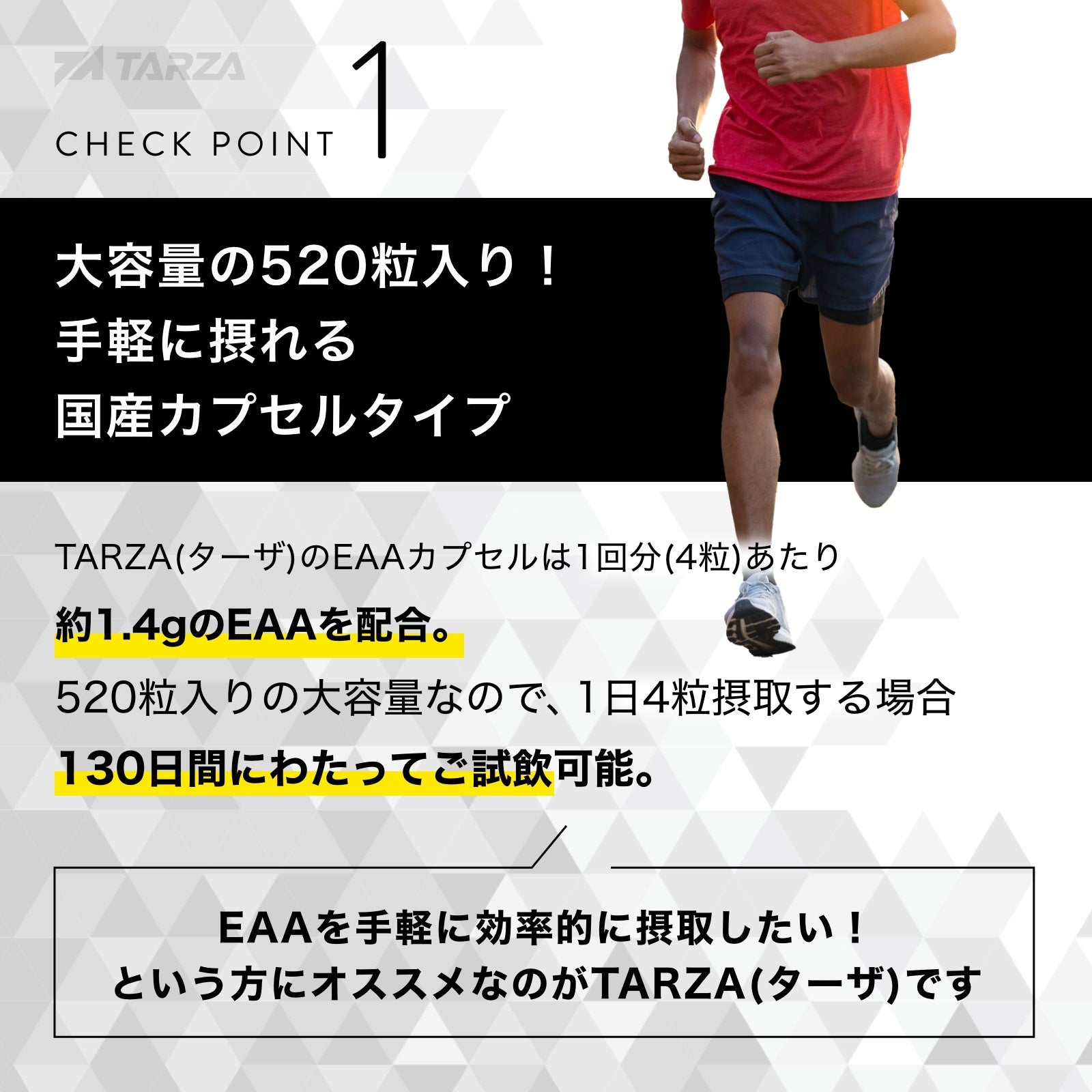 TARZA(ターザ)のEAAカプセルは、4粒あたり1,360mgのEAAを配合し、無味無臭、合成甘味料と着色料は不使用、520粒入(約130回分)のコスパに優れた大容量タイプです。520粒合計では176,800mgのEAAを配合しています。