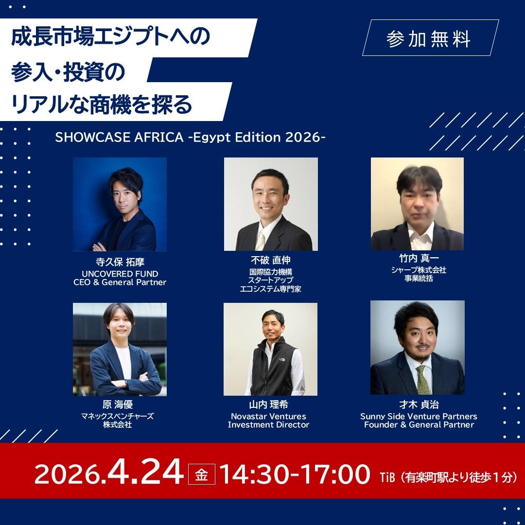 スタートアップ・VC・日本企業が交差する特別イベント「SHOWCASE AFRICA -Egypt Edition 2026-」を、TIB(東京駅から徒歩5分)にて開催いたします。